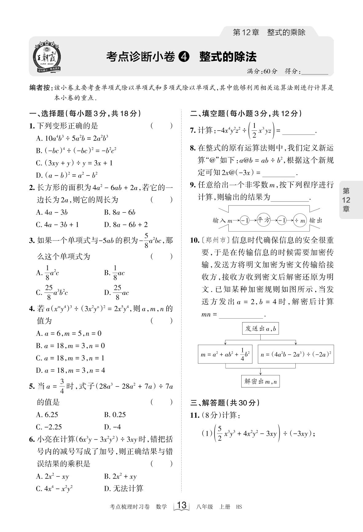 2023上册八年级数学华师版 第12章 考点诊断小卷4 整式的除法