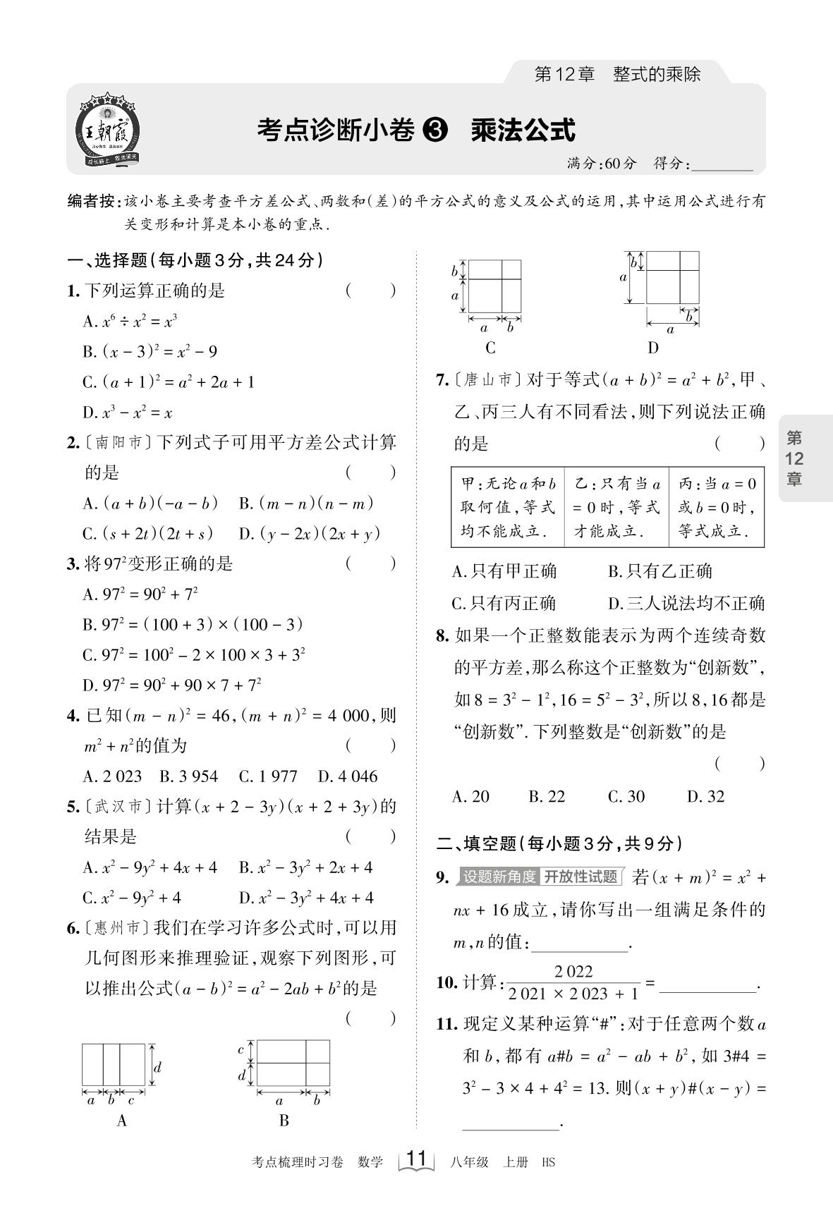 2023上册八年级数学华师版 第12章 考点诊断小卷3 乘法公式