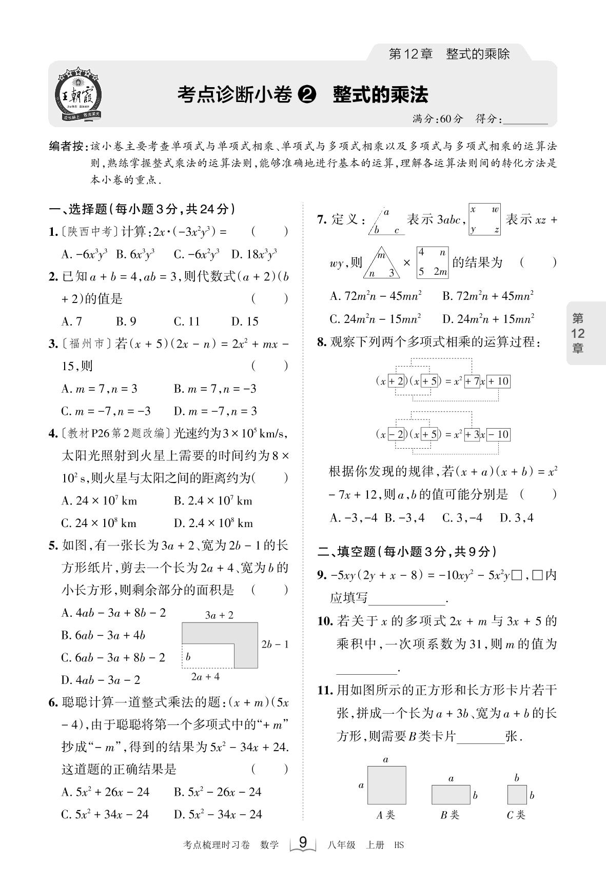 2023上册八年级数学华师版 第12章 考点诊断小卷2 整式的乘法