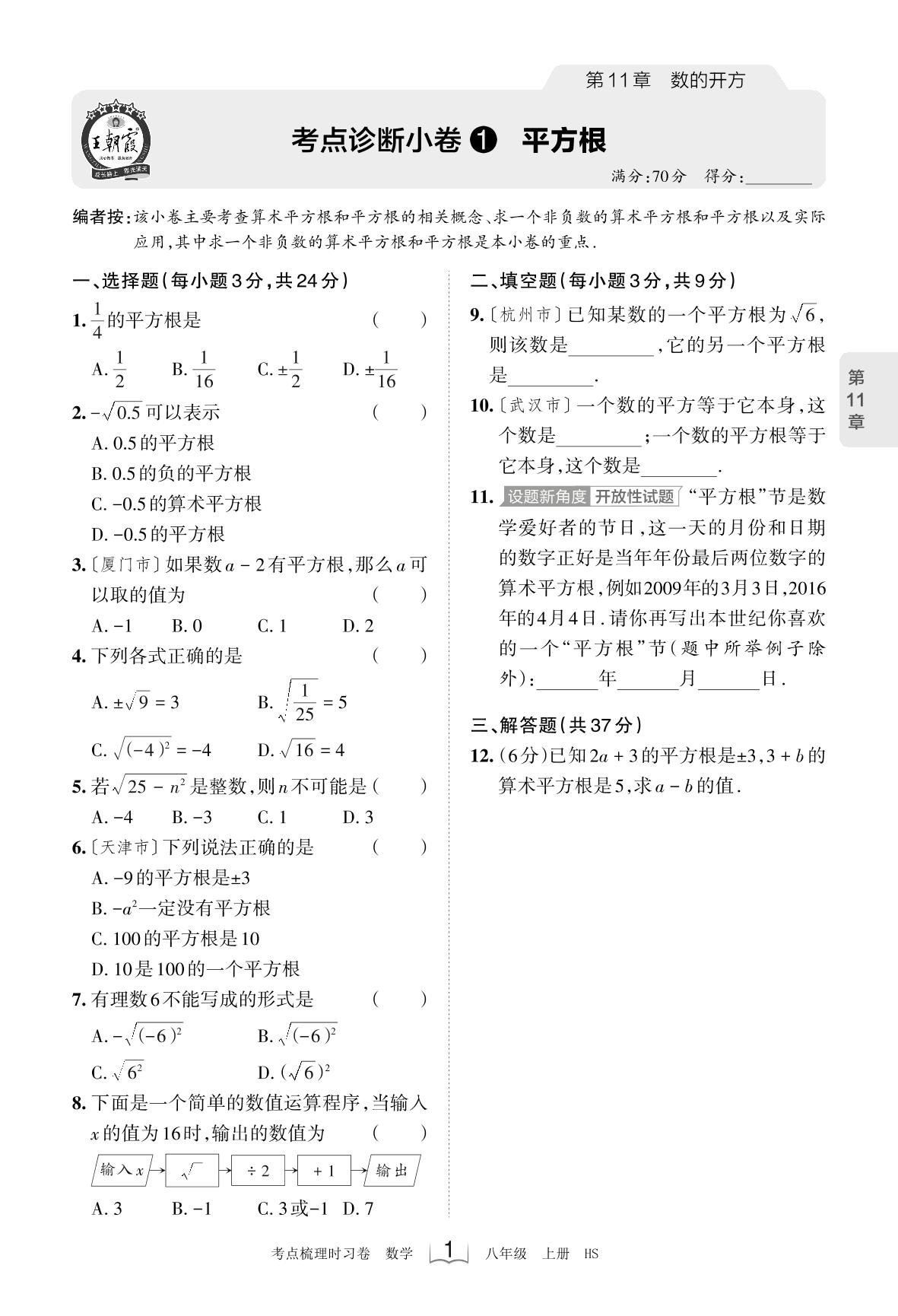 2023上册八年级数学华师版 第11章 考点诊断小卷1 平方根