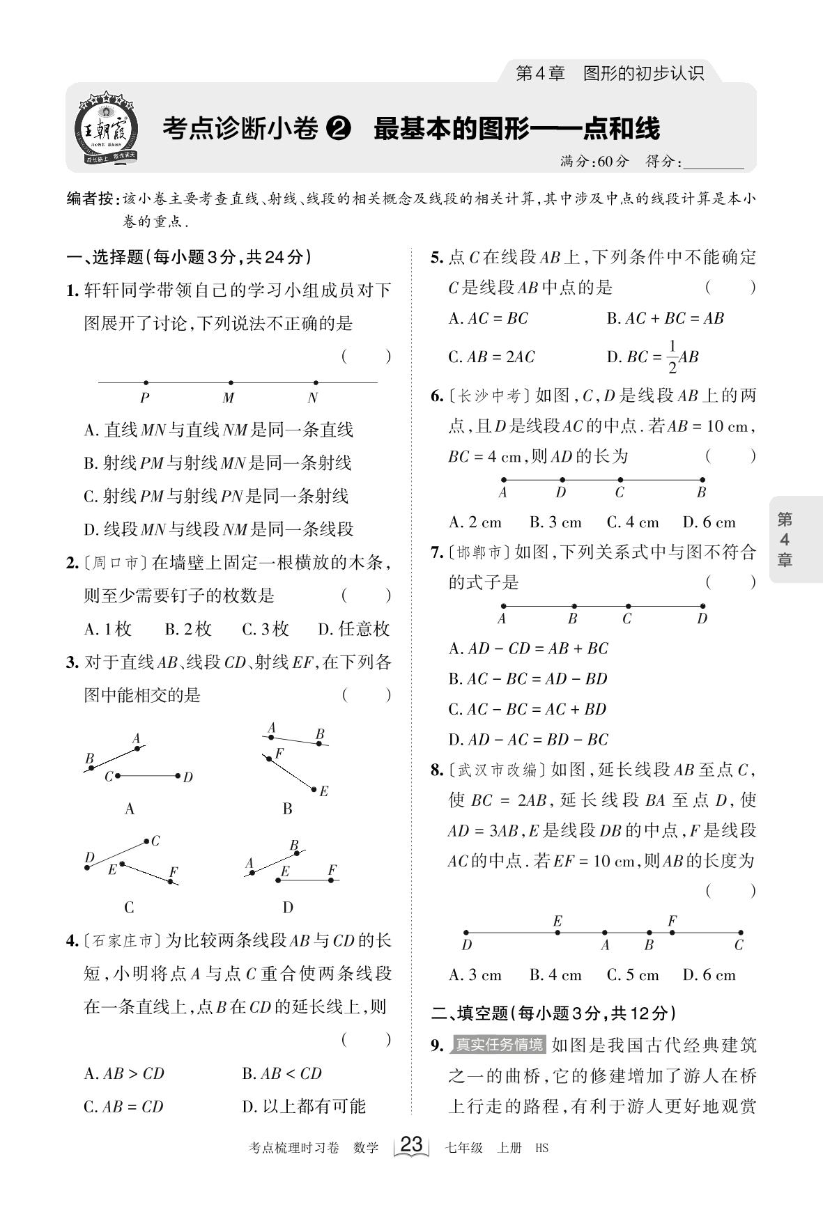 2023上册七年级数学华师版 第4章 考点诊断小卷2 最基本的图形——点和线