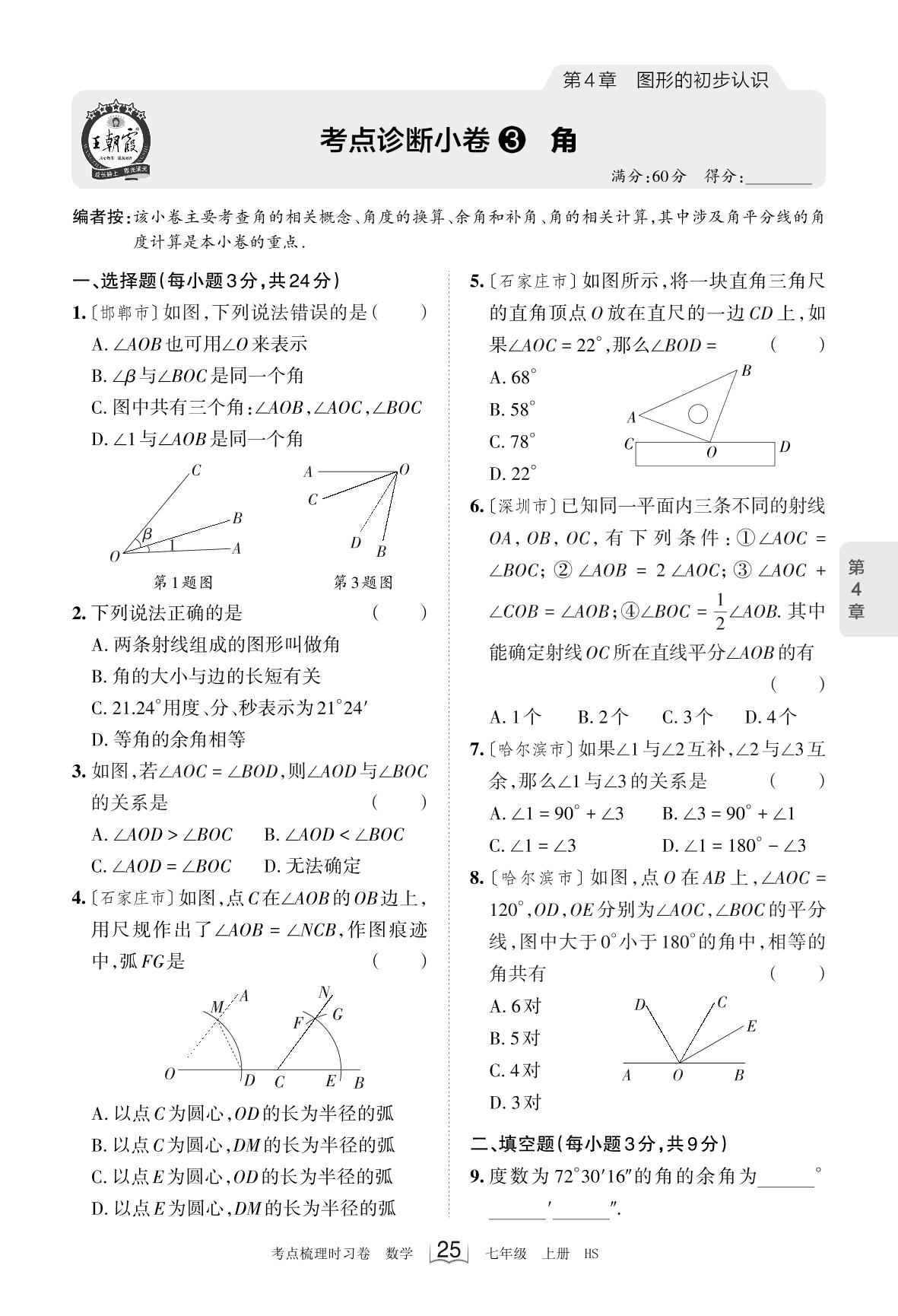 2023上册七年级数学华师版 第4章 考点诊断小卷3 角