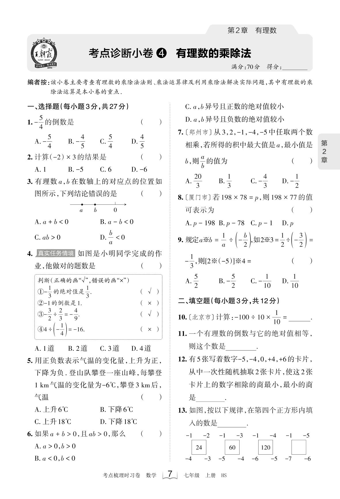 2023上册七年级数学华师版 第2章 考点诊断小卷4 有理数的乘除法