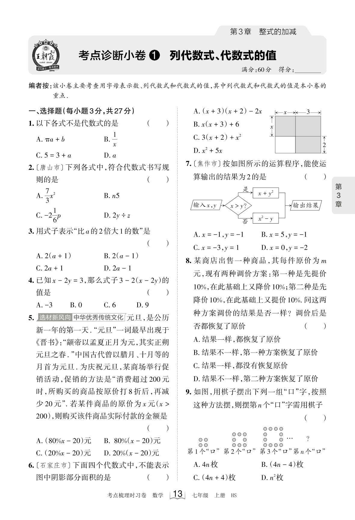 2023上册七年级数学华师版 第3章 考点诊断小卷1 列代数式、代数式的值