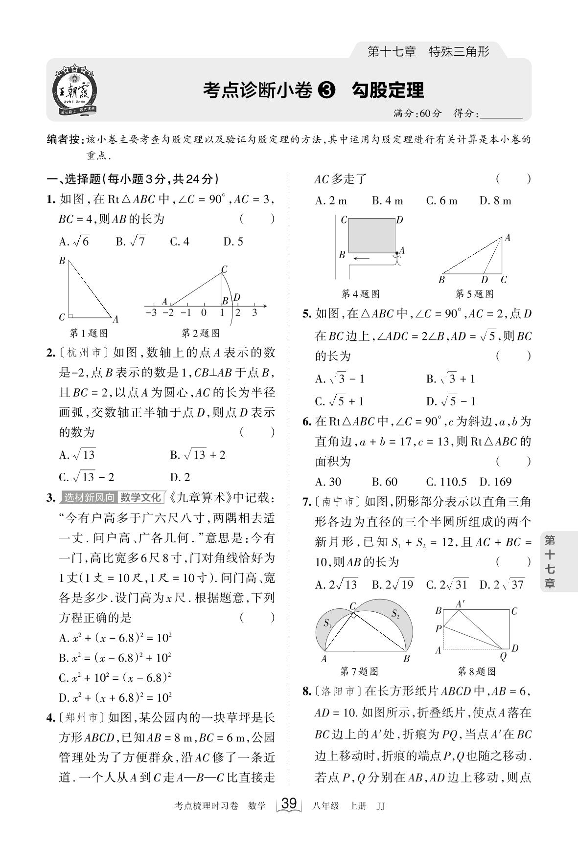 2023上册八年级数学冀教版 第十七章 考点诊断小卷3 勾股定理