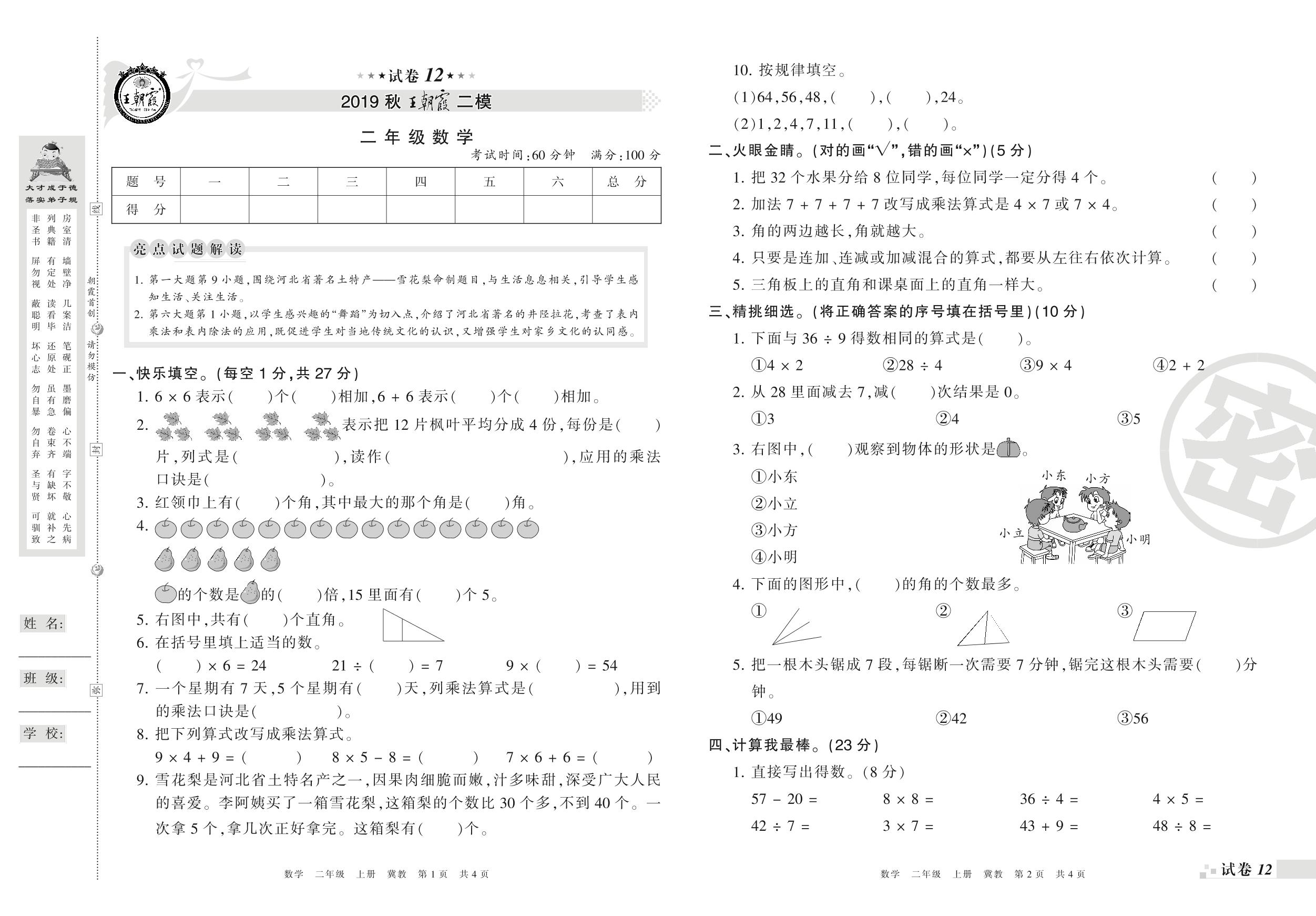 王朝霞期末模拟卷二年级上册数学(冀教版)_R21080392822【12】