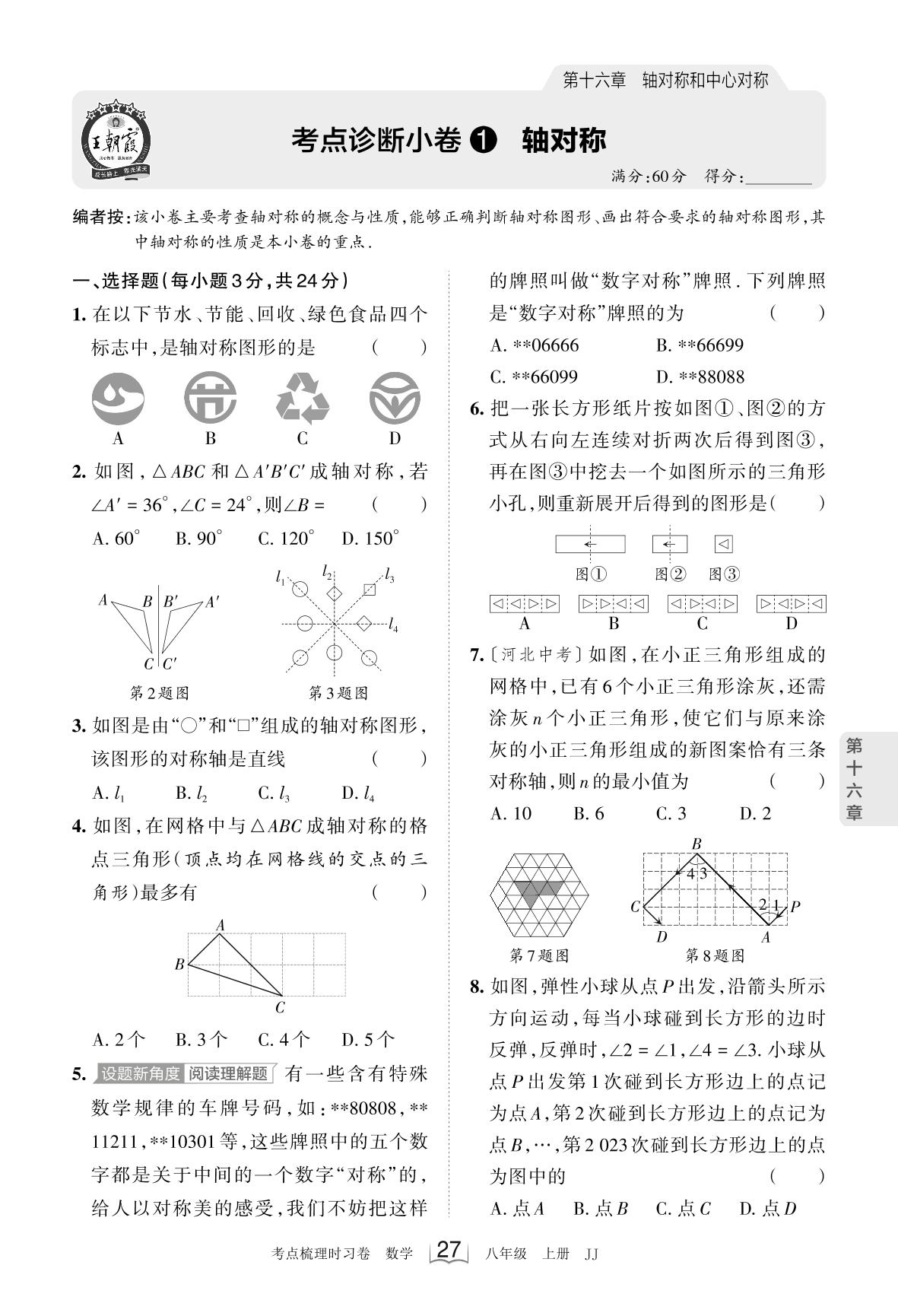 2023上册八年级数学冀教版 第十六章 考点诊断小卷1 轴对称