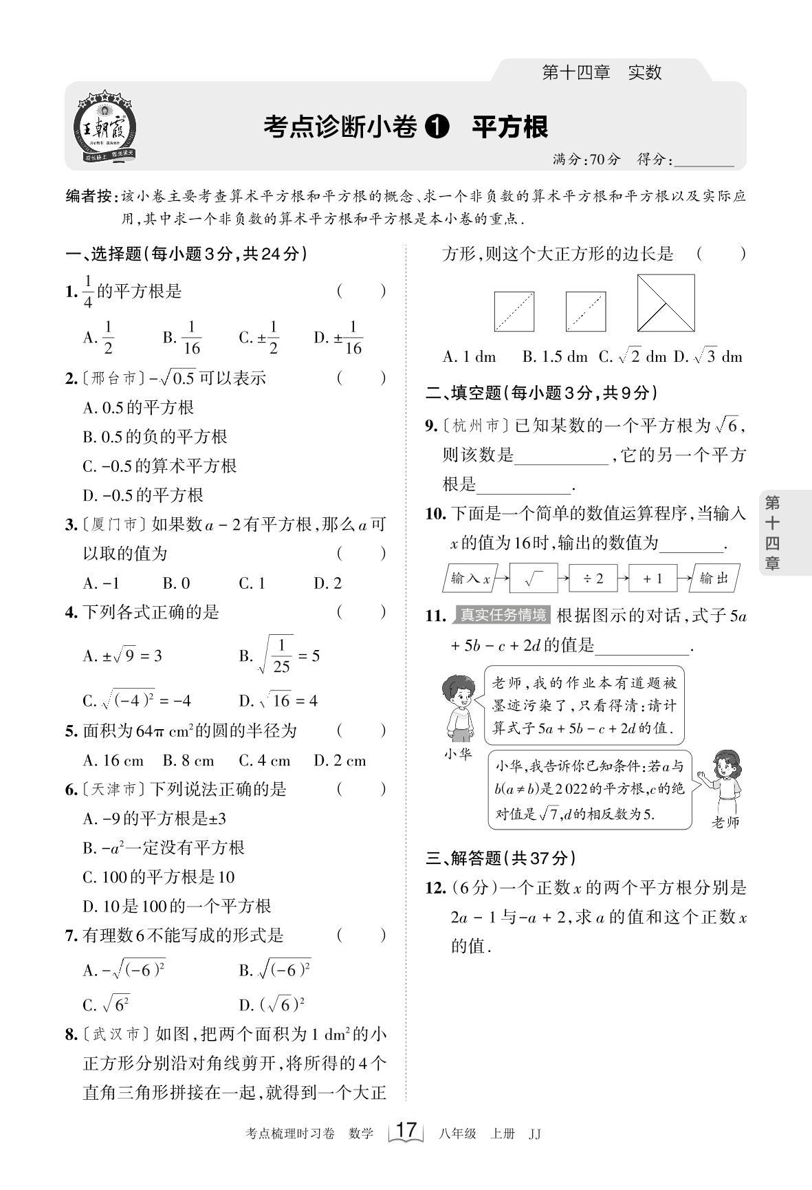 2023上册八年级数学冀教版 第十四章 考点诊断小卷1 平方根