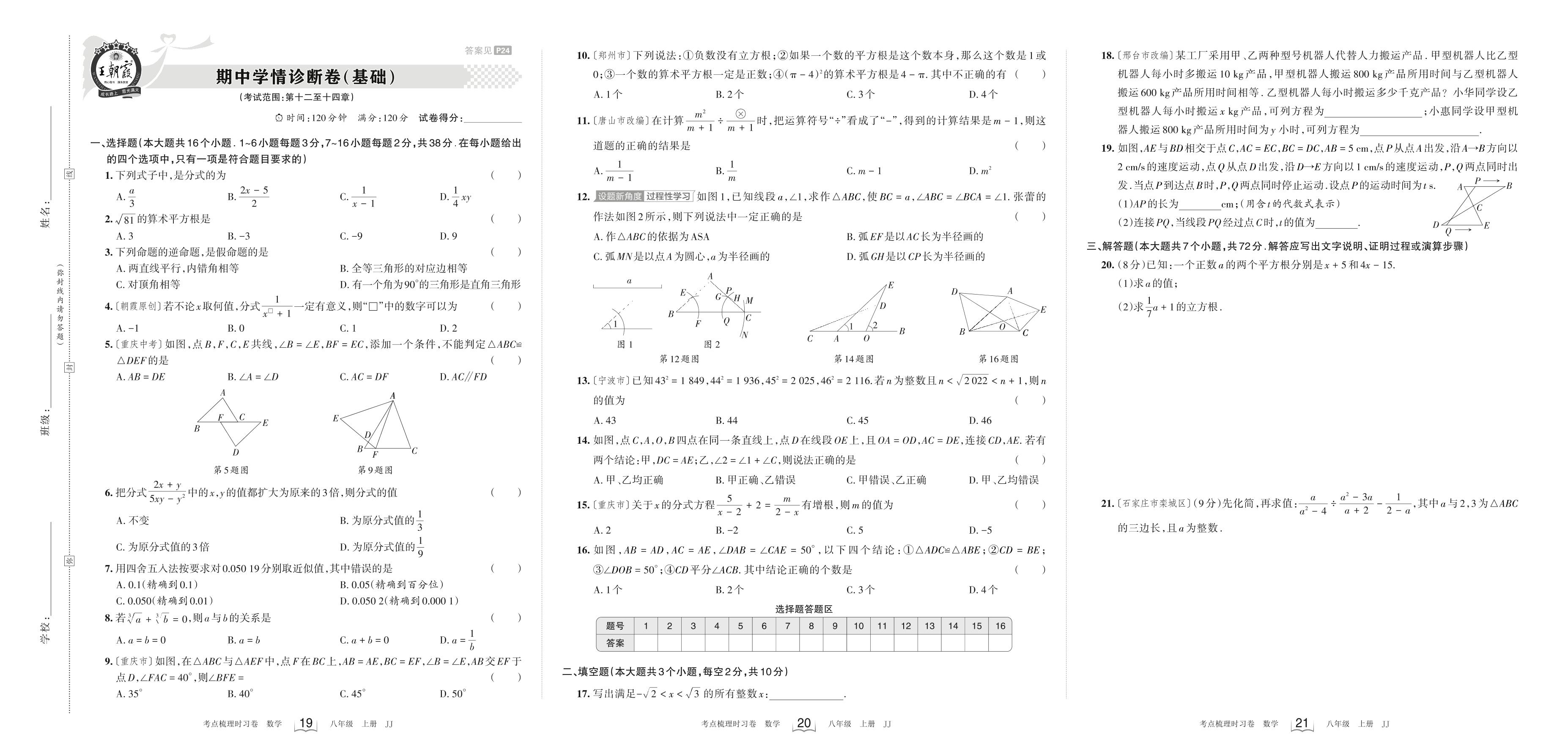 2023上册八年级数学冀教版 期中学情诊断卷(基础)