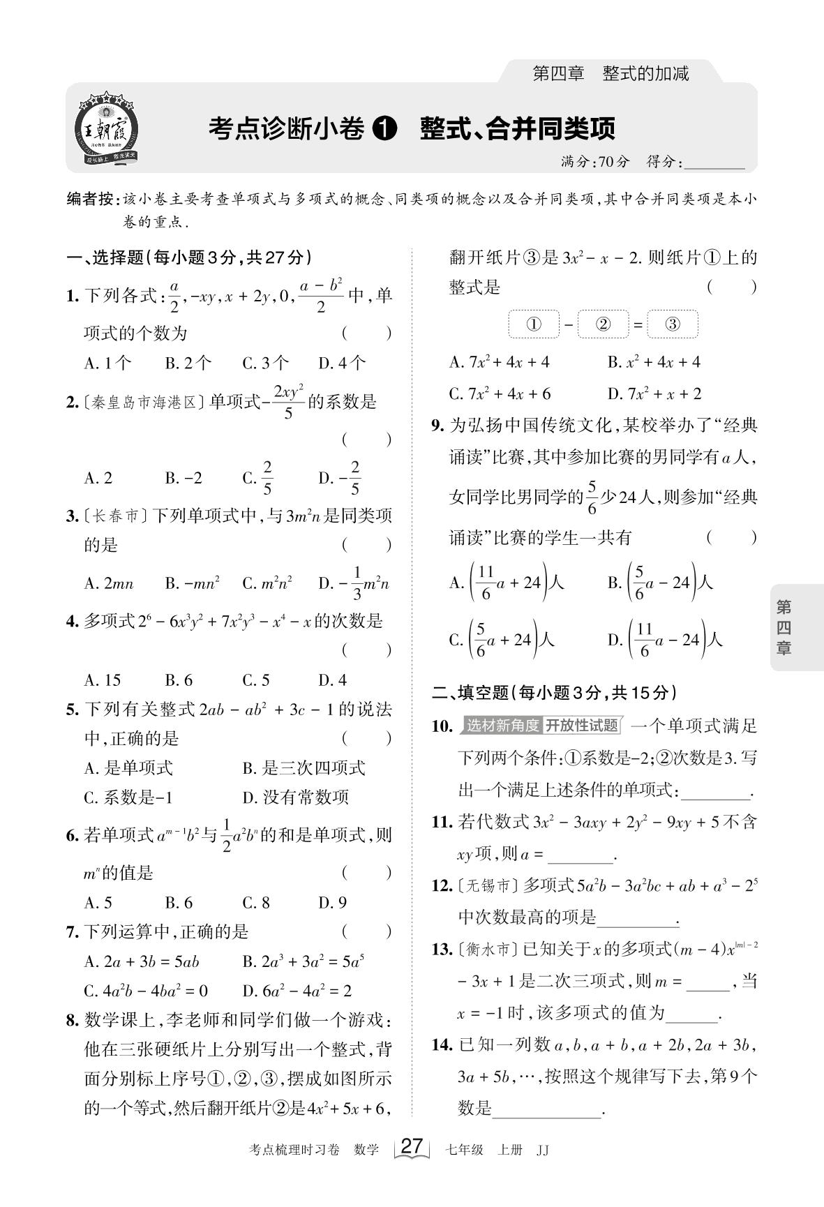 2023上册七年级数学冀教版 第四章 考点诊断小卷1 整式、合并同类项