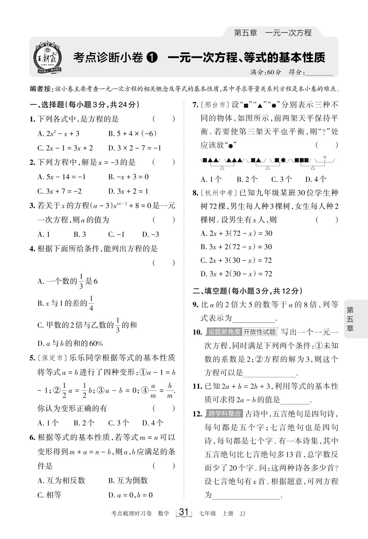 2023上册七年级数学冀教版 第五章 考点诊断小卷1 一元一次方程、等式的基本性质