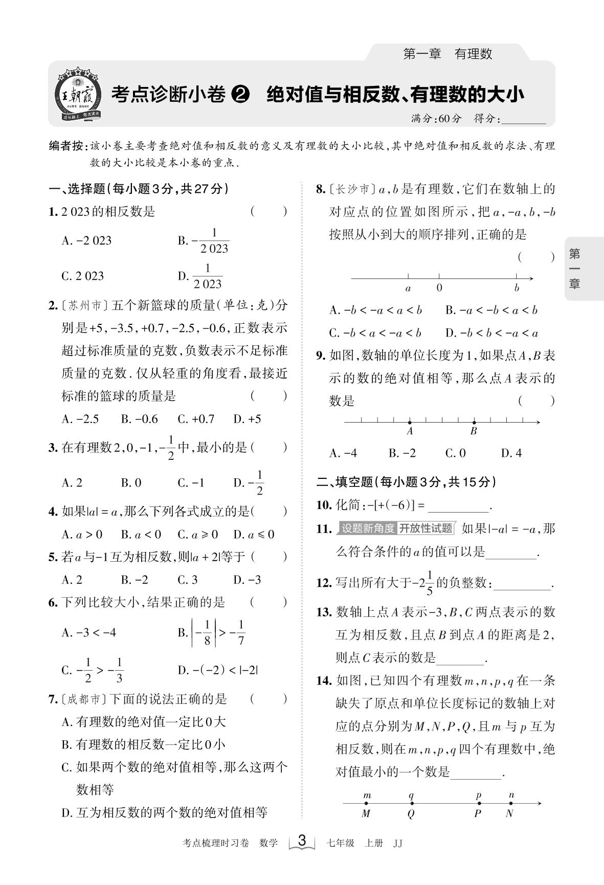 2023上册七年级数学冀教版 第一章 考点诊断小卷2 绝对值与相反数、有理数的大小