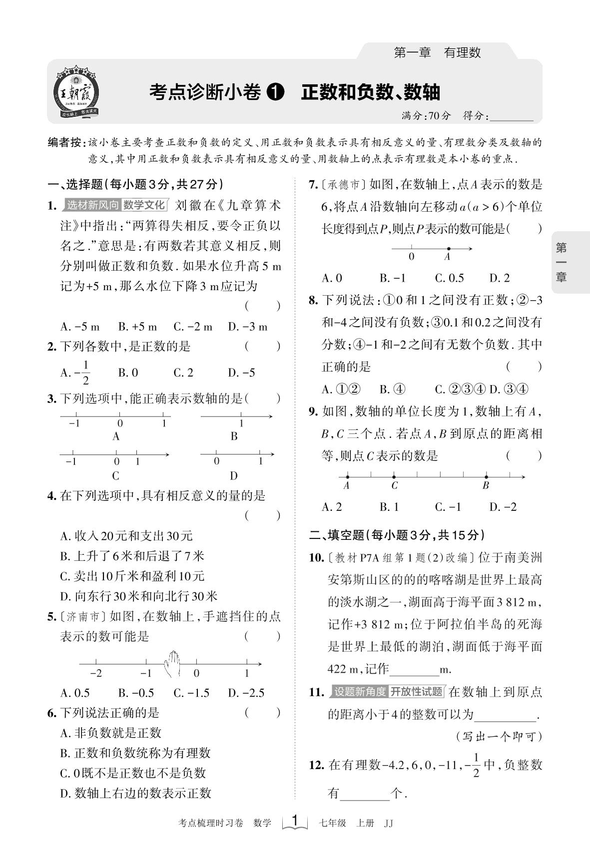2023上册七年级数学冀教版 第一章 考点诊断小卷1 正数和负数、数轴