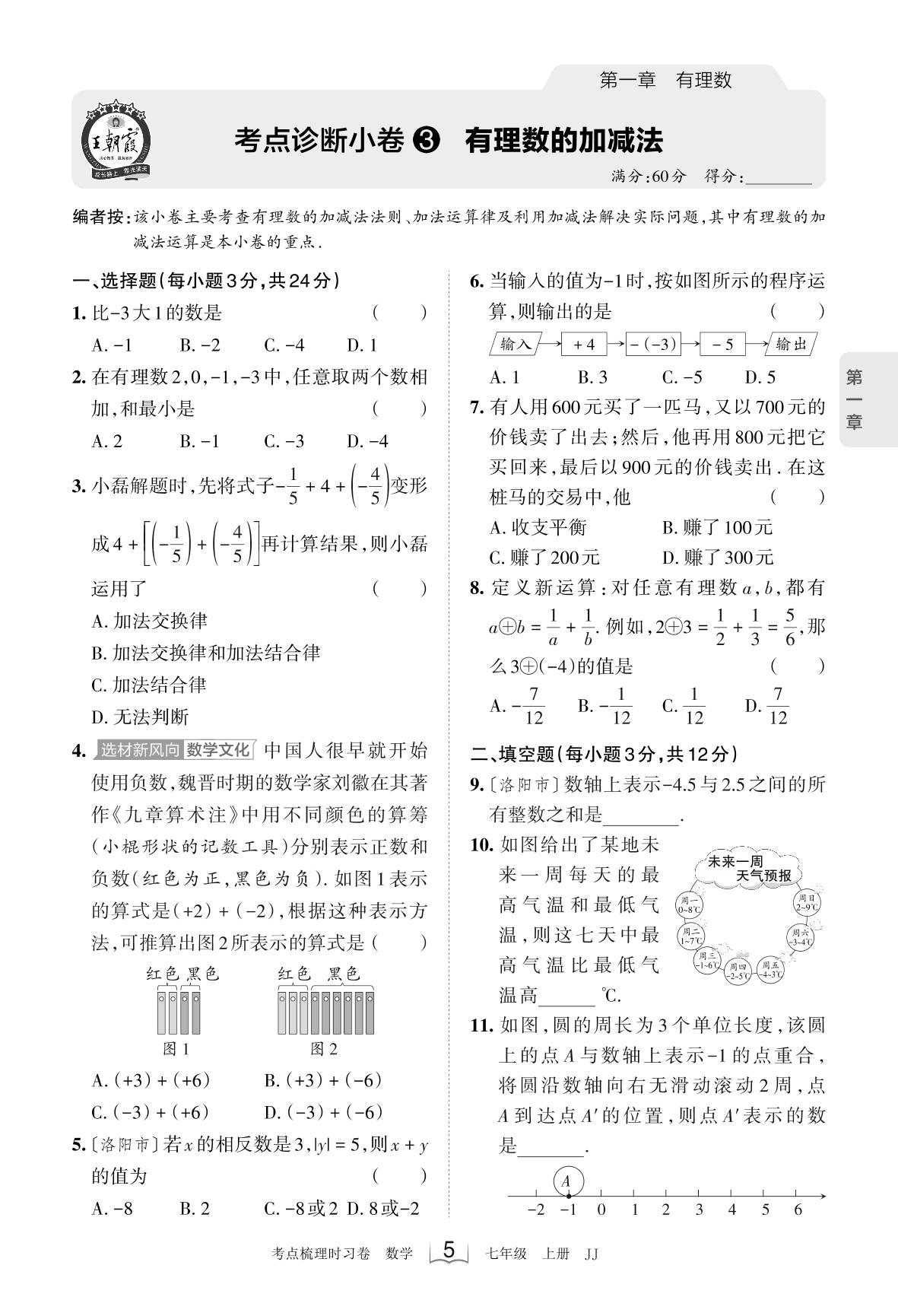 2023上册七年级数学冀教版 第一章 考点诊断小卷3 有理数的加减法