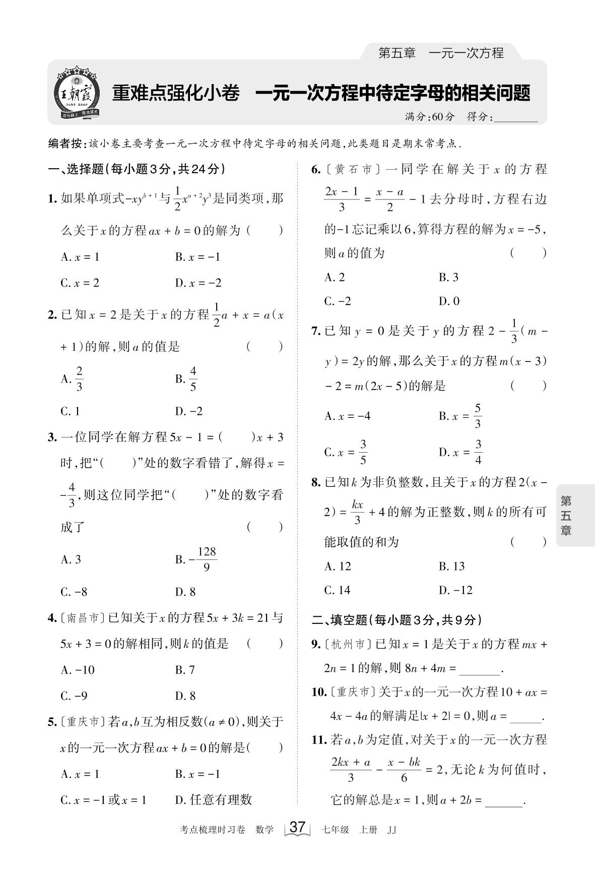 2023上册七年级数学冀教版 第五章 重难点强化小卷 一元一次方程中待定字母的相关问题