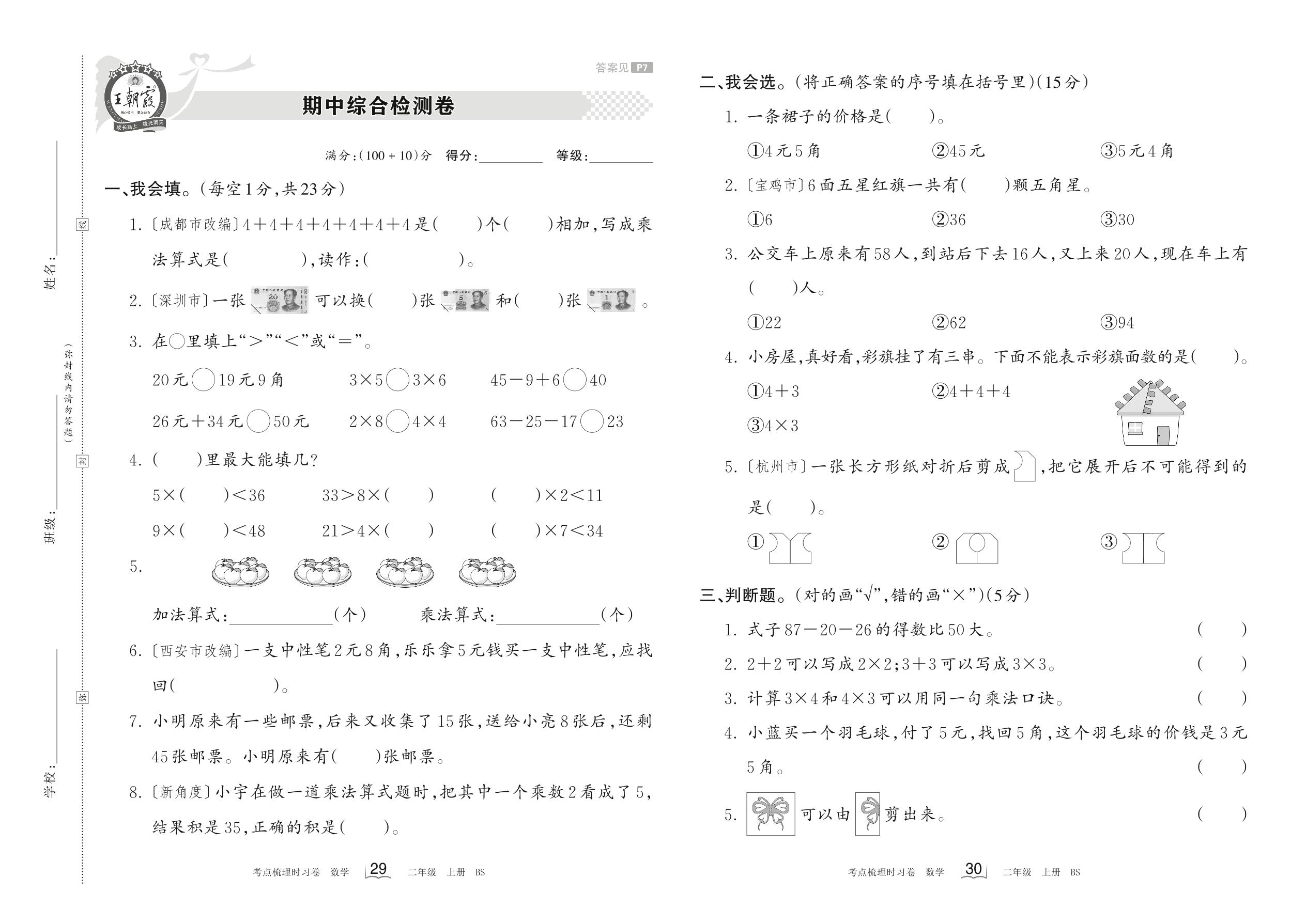 2023上册二年级数学北师版 期中综合检测卷