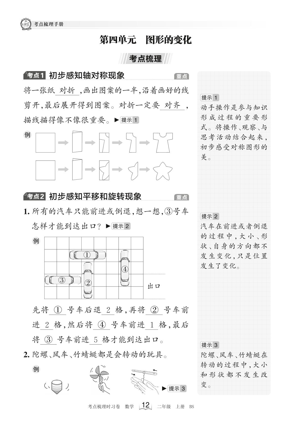 2023上册二年级数学北师版 考点梳理手册——第四单元 图形的变化