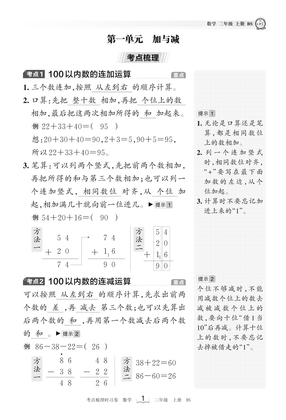 2023上册二年级数学北师版 考点梳理手册——第一单元 加与减