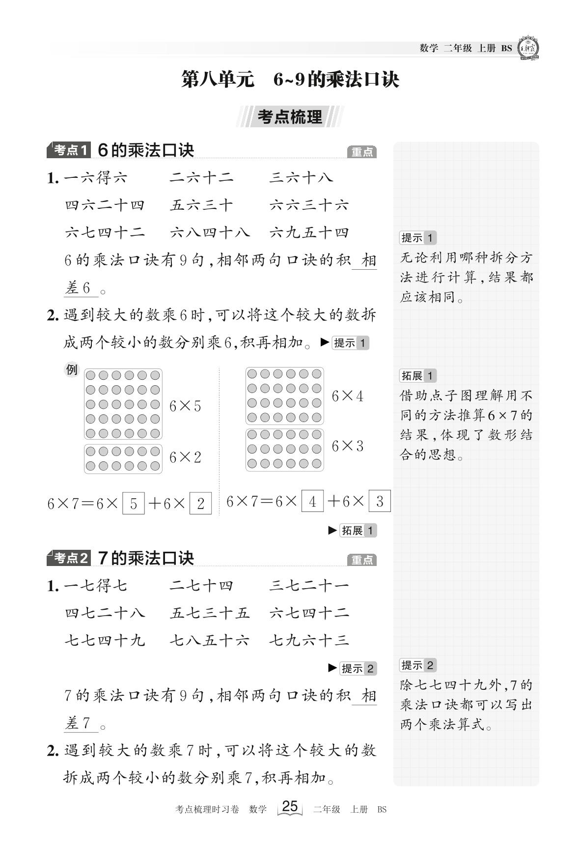 2023上册二年级数学北师版 考点梳理手册——第八单元 6~9的乘法口诀