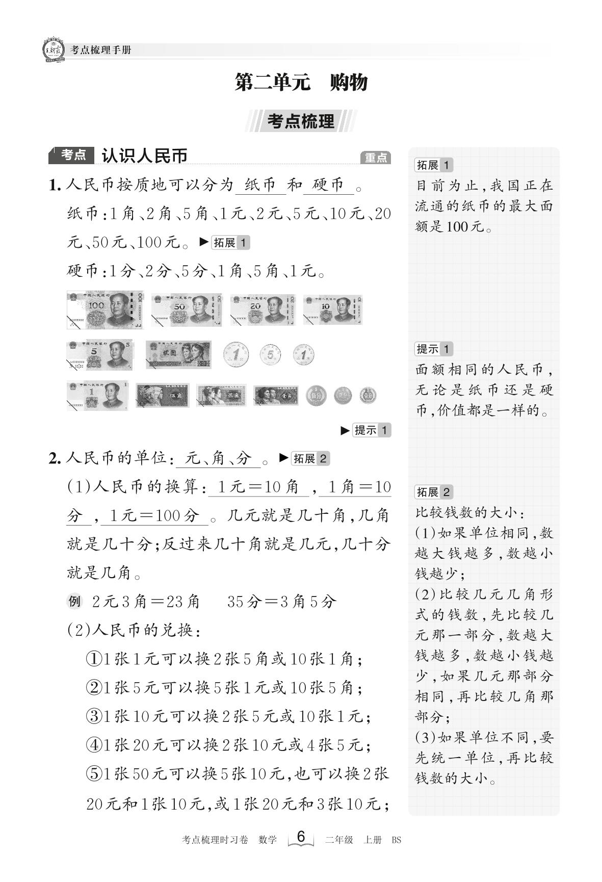 2023上册二年级数学北师版 考点梳理手册——第二单元 购物
