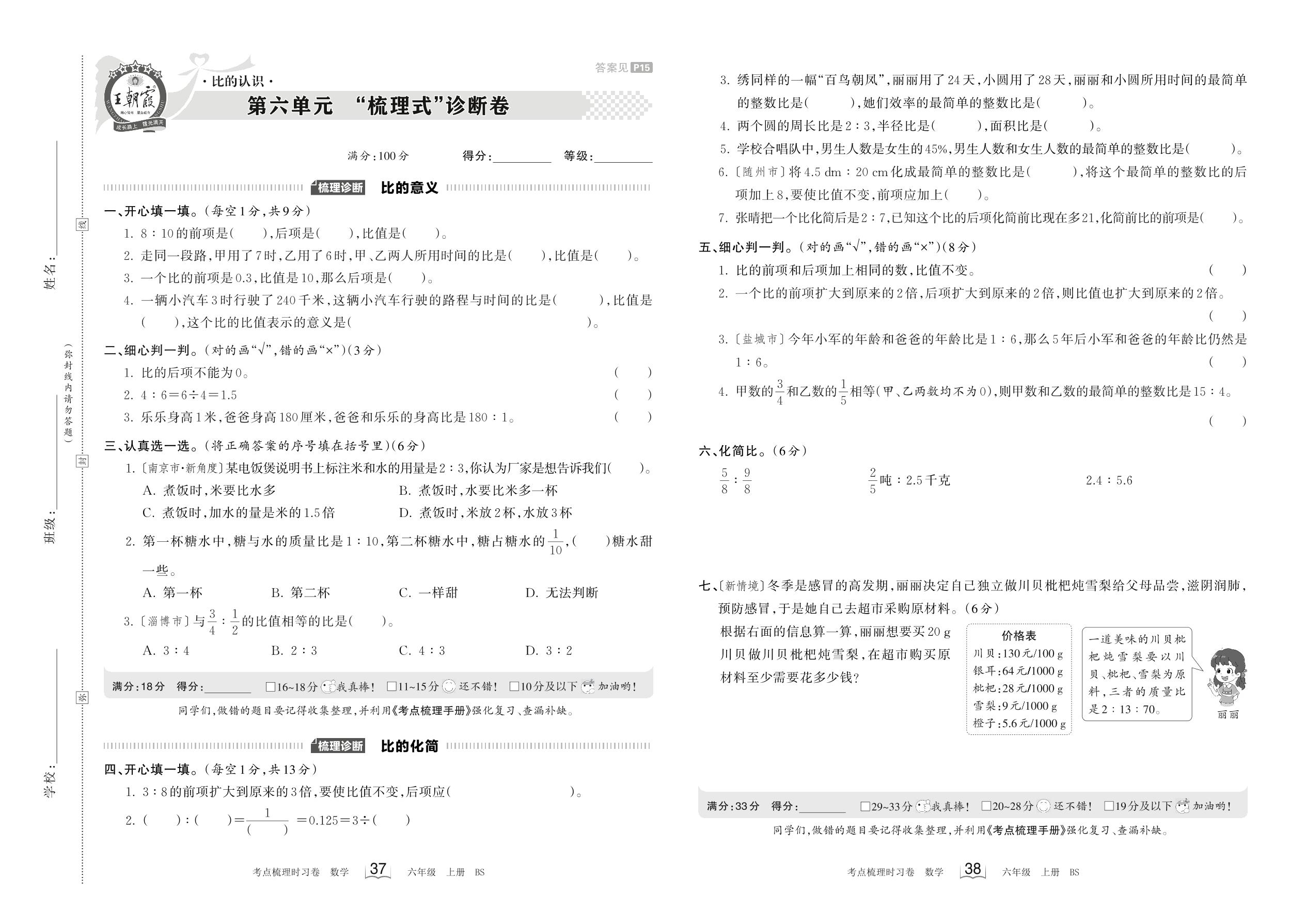 2023上册六年级数学北师版 第六单元 “梳理式”诊断卷