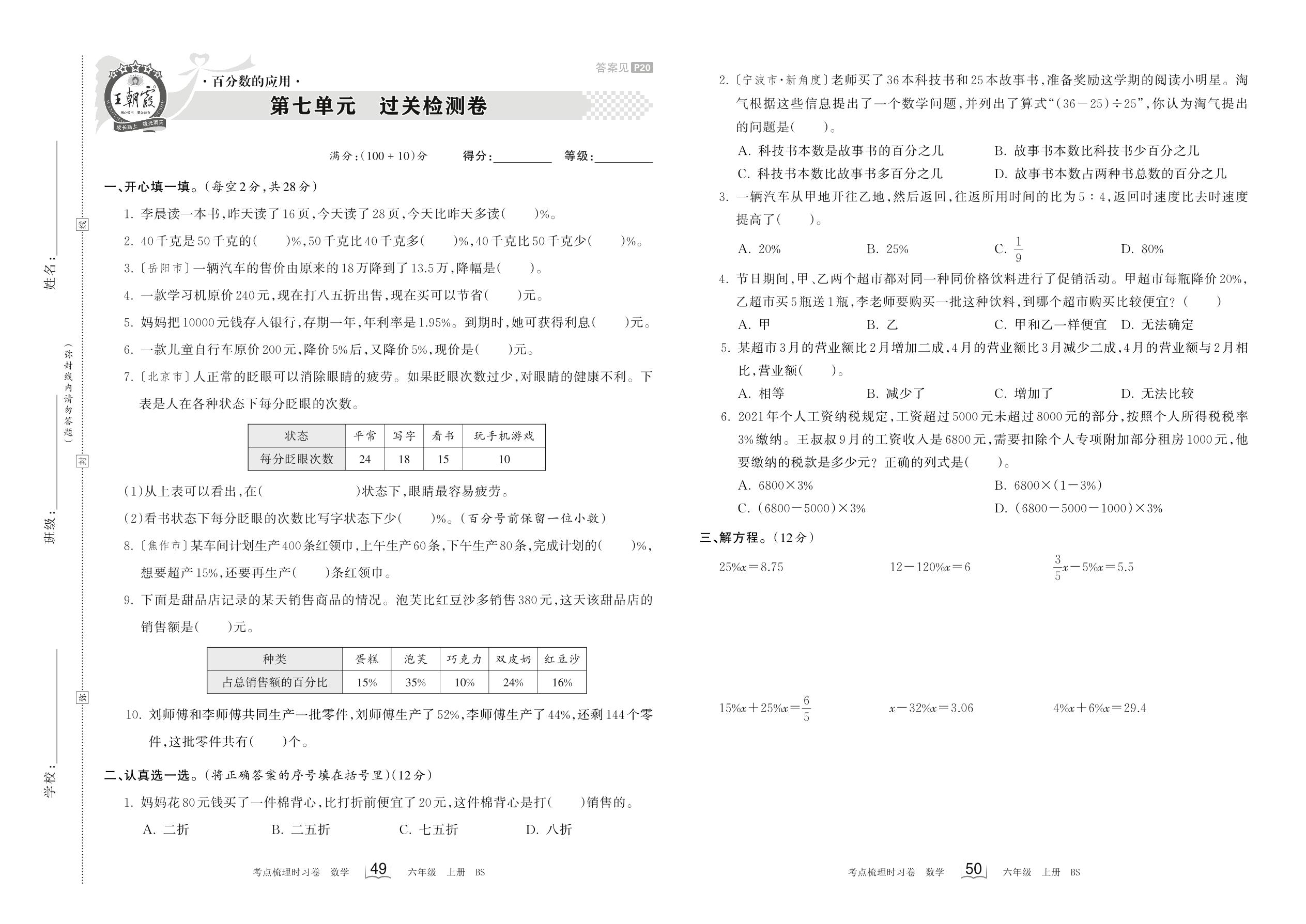 2023上册六年级数学北师版 第七单元 过关检测卷