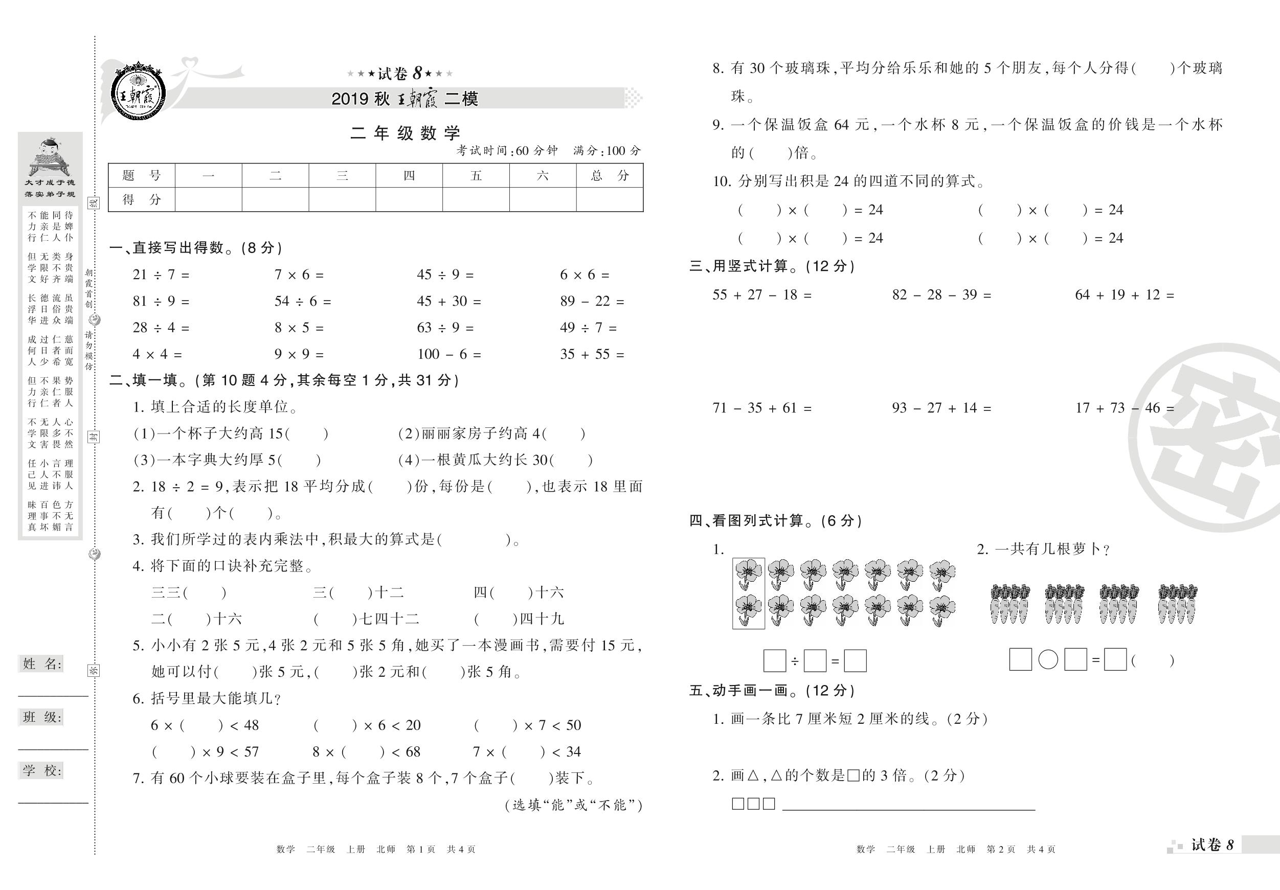 王朝霞期末模拟卷二年级上册数学(北师版)_R21080392906【8】