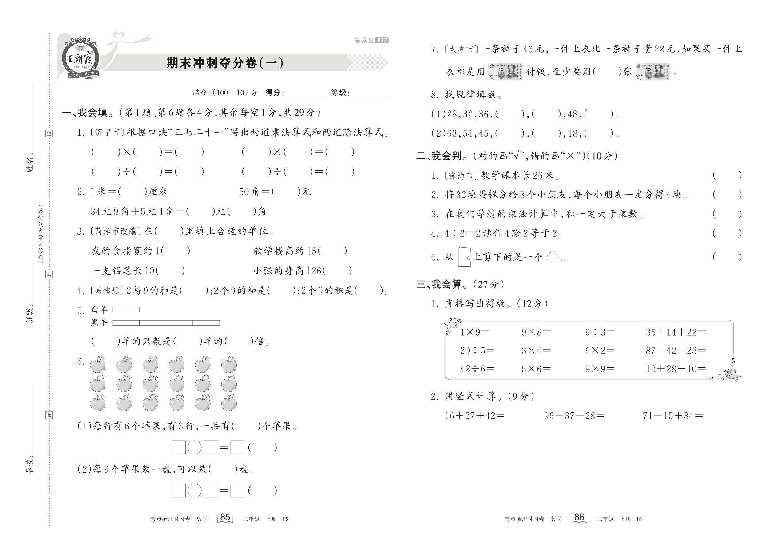 2023上册二年级数学北师版 期末冲刺夺分卷(一)