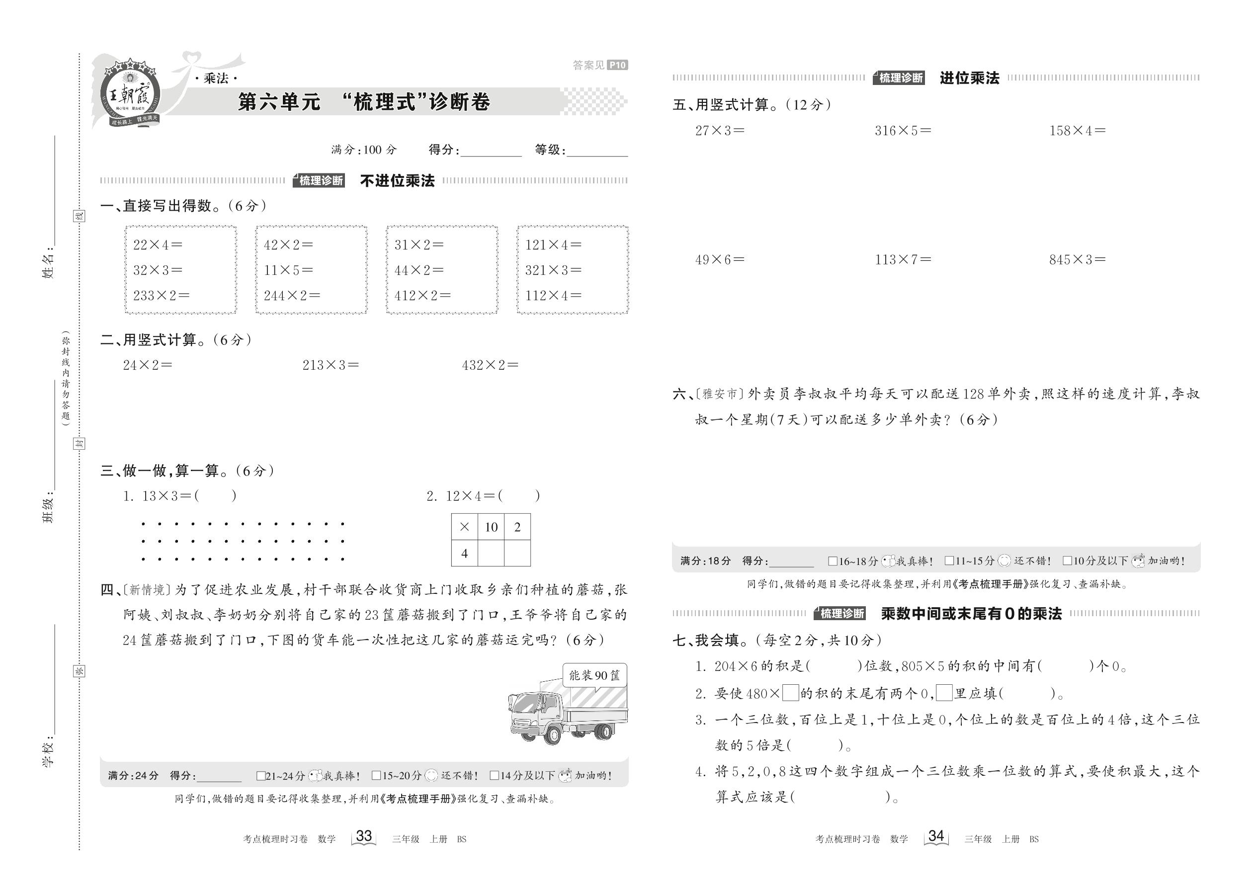 2023上册三年级数学北师版 第六单元 “梳理式”诊断卷