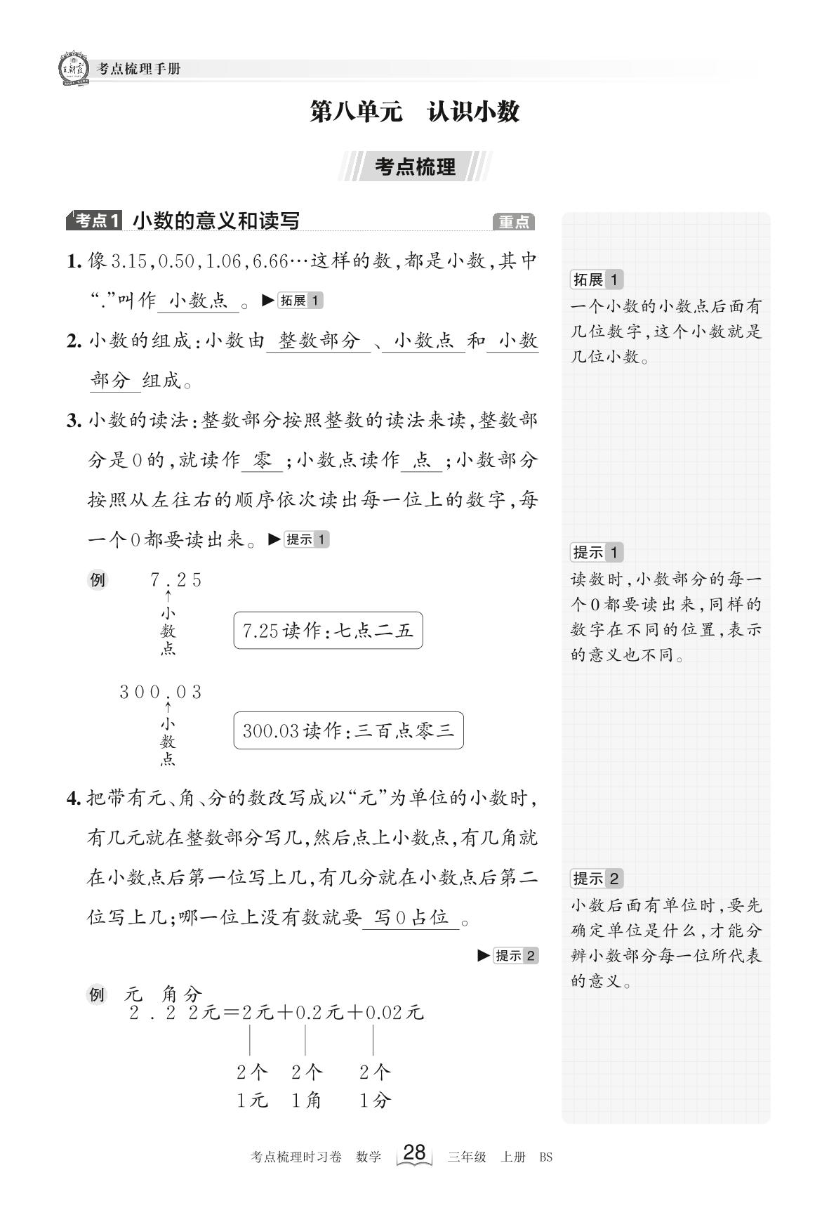 2023上册三年级数学北师版 考点梳理手册——第八单元 认识小数