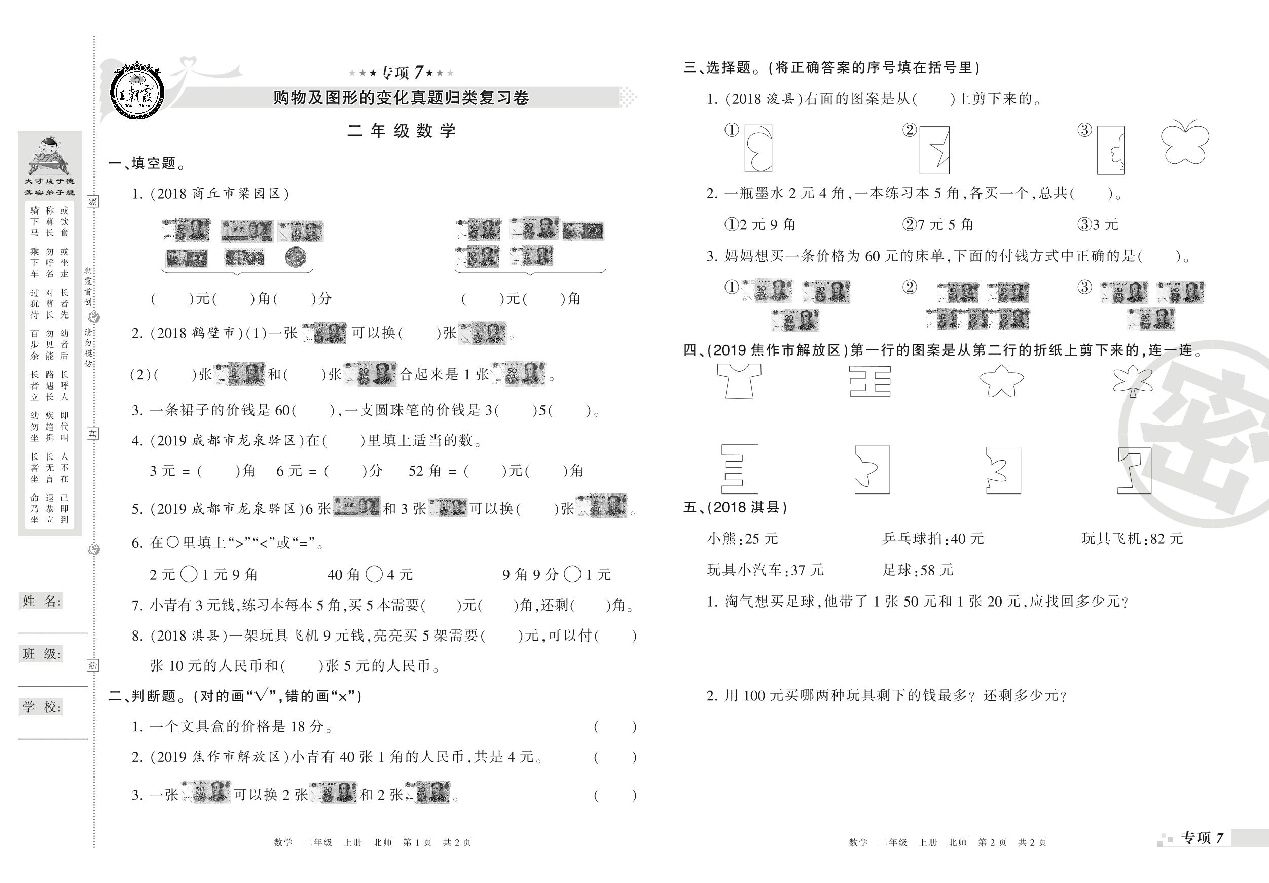 王朝霞期末专项卷——购物及图形的变化、测量真题归类复习二年级上册数学(北师版)_R21080392925【0】