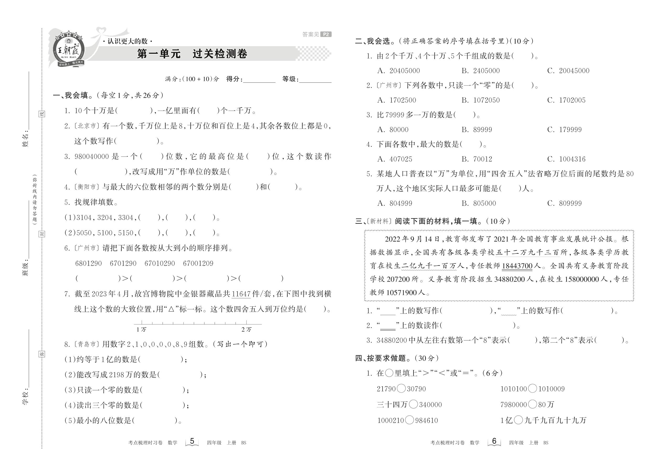 2023上册四年级数学北师版 第一单元 过关检测卷