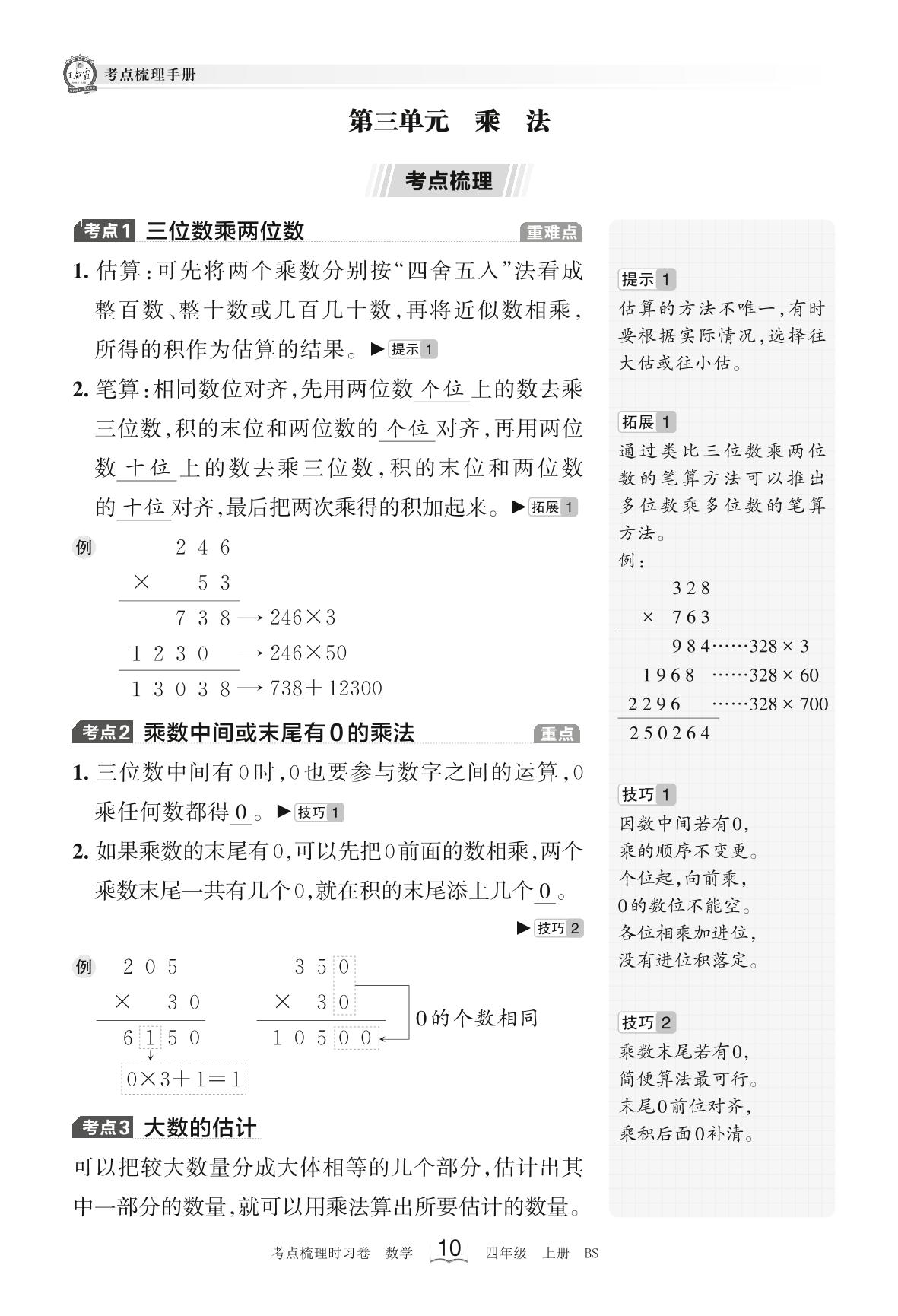 2023上册四年级数学北师版 考点梳理手册——第三单元 乘法