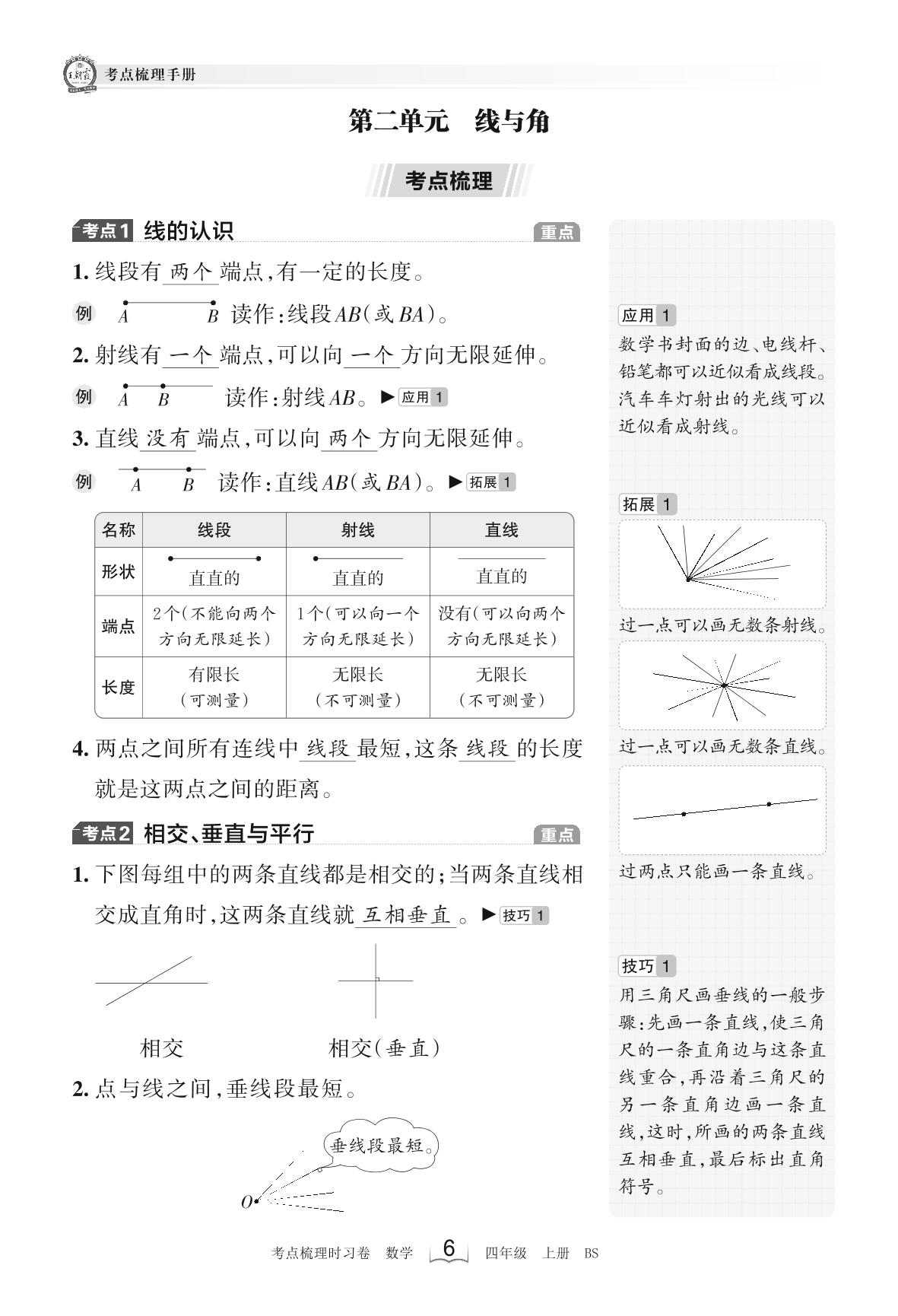 2023上册四年级数学北师版 考点梳理手册——第二单元 线与角