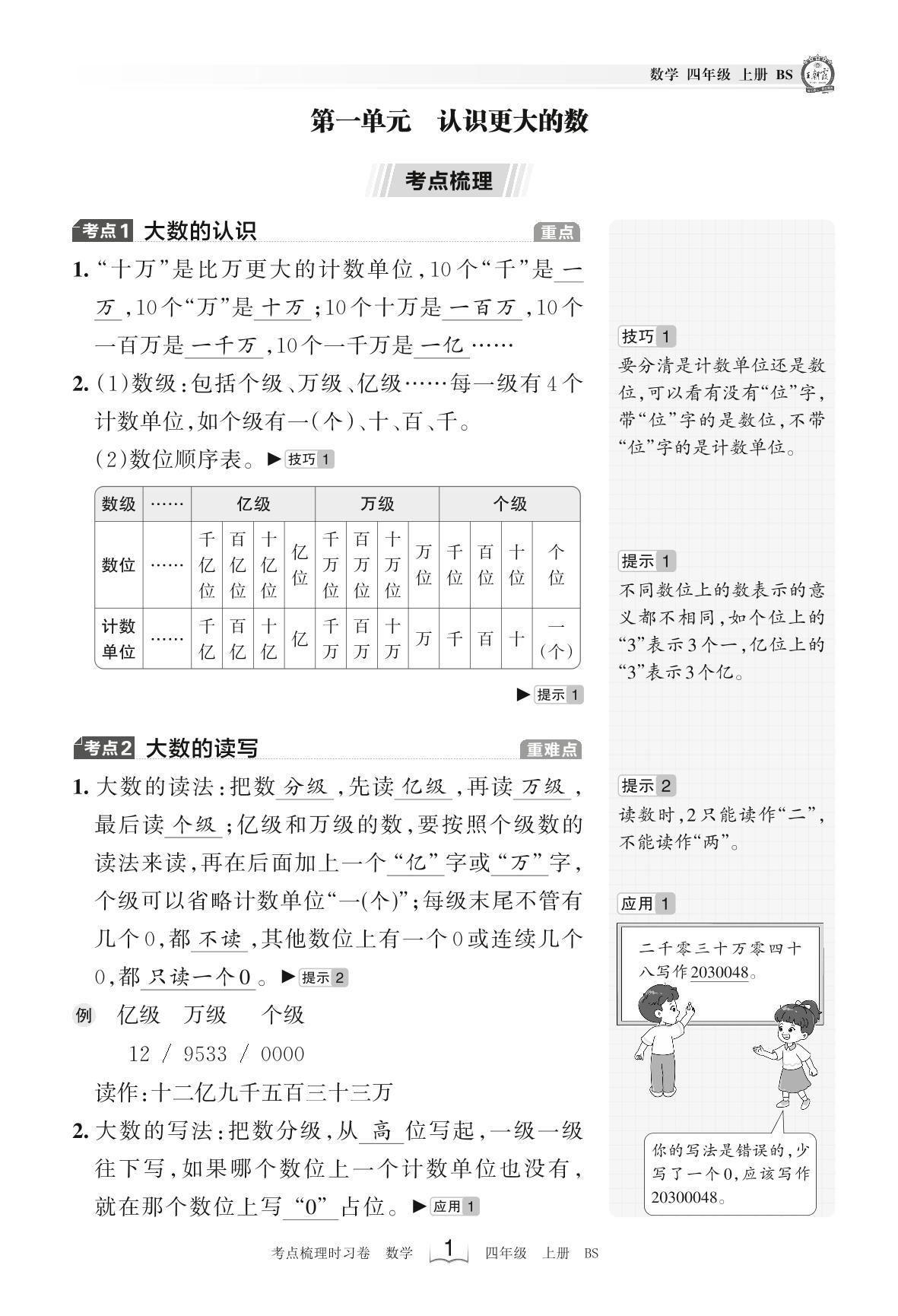 2023上册四年级数学北师版 考点梳理手册——第一单元 认识更大的数