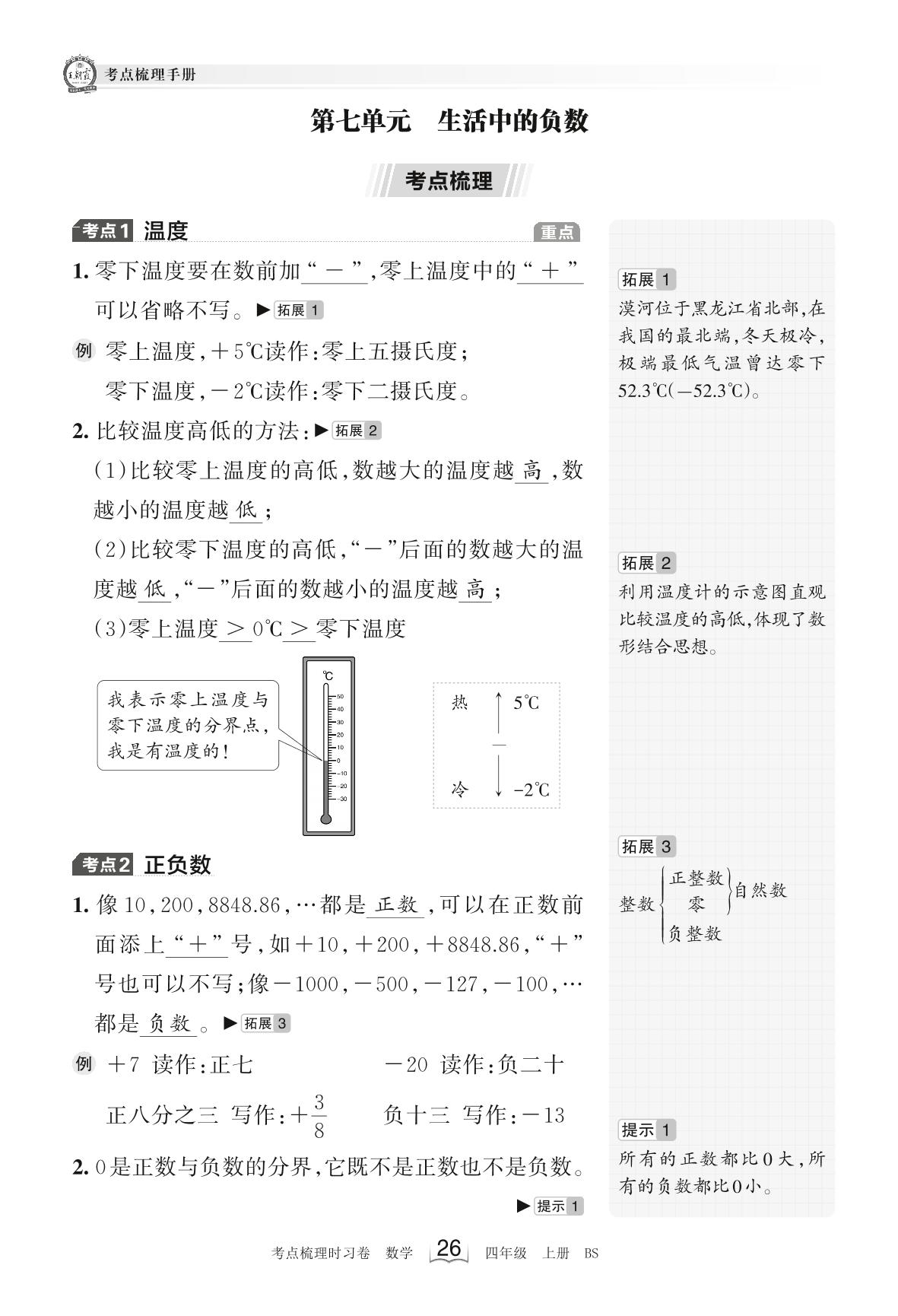 2023上册四年级数学北师版 考点梳理手册——第七单元 生活中的负数