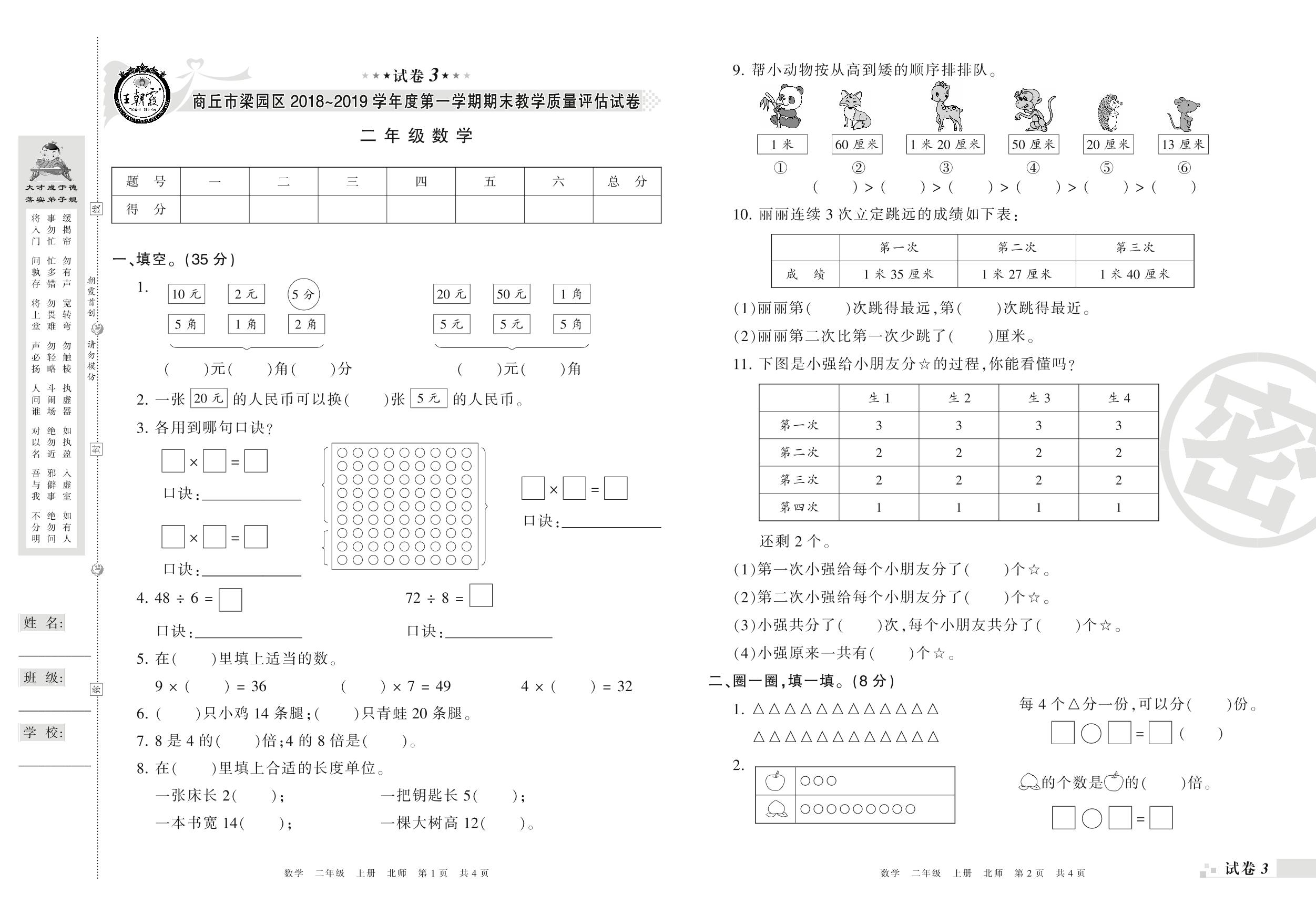 2018-2019学年第一学期商丘市梁园区二年级数学试卷(北师版)【3】