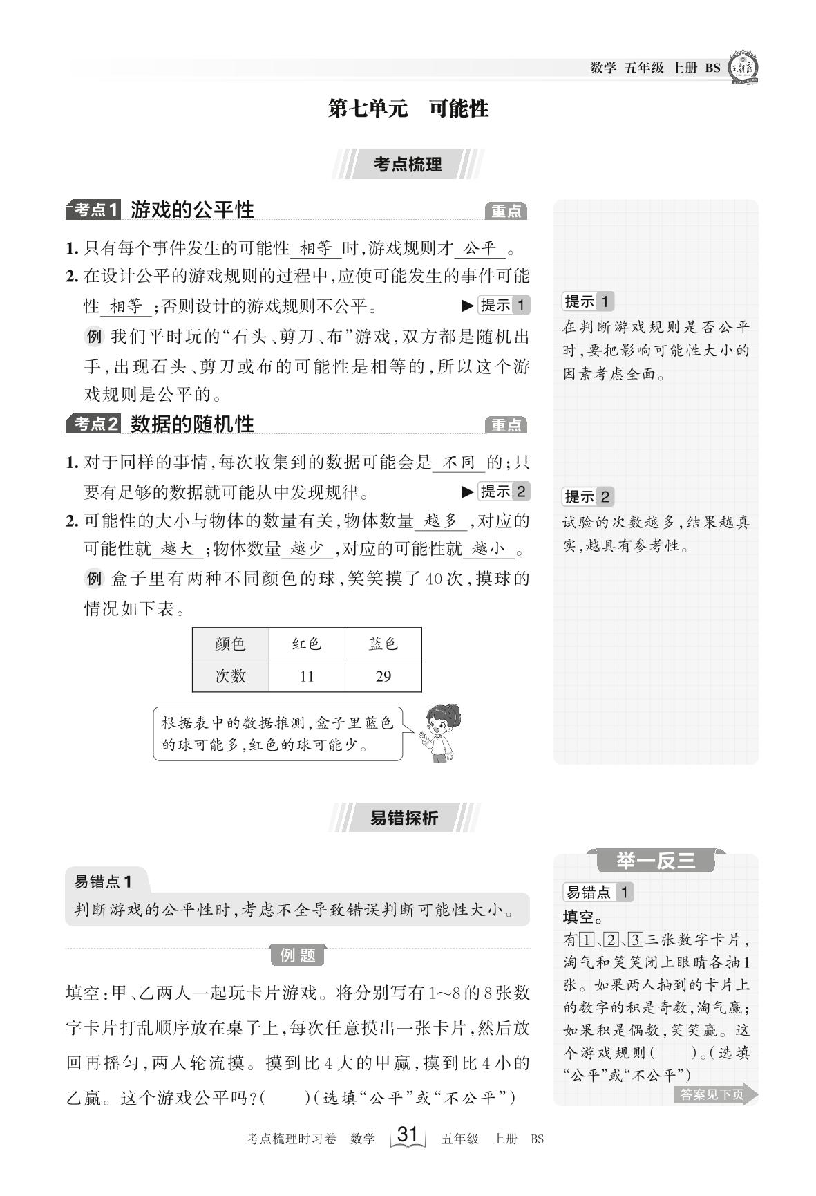 2023上册五年级数学北师版 考点梳理手册——第七单元 可能性