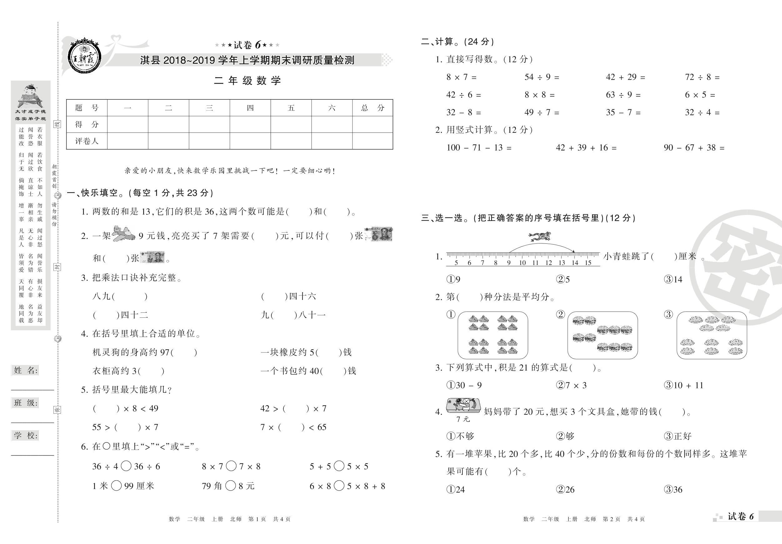 2018-2019学年第一学期鹤壁市淇县二年级数学试卷(北师版)【6】