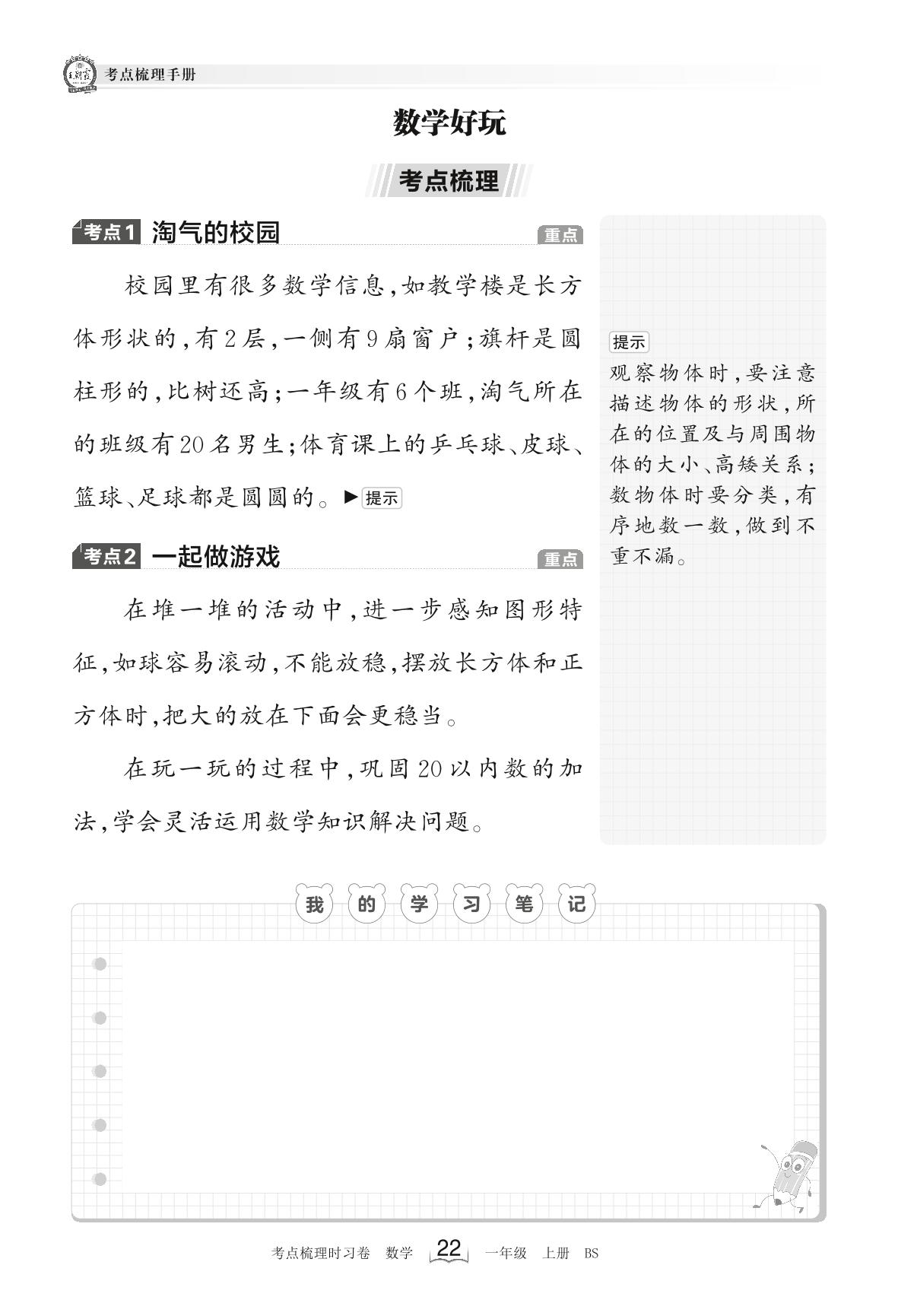 2023上册一年级数学北师版 考点梳理手册——数学好玩