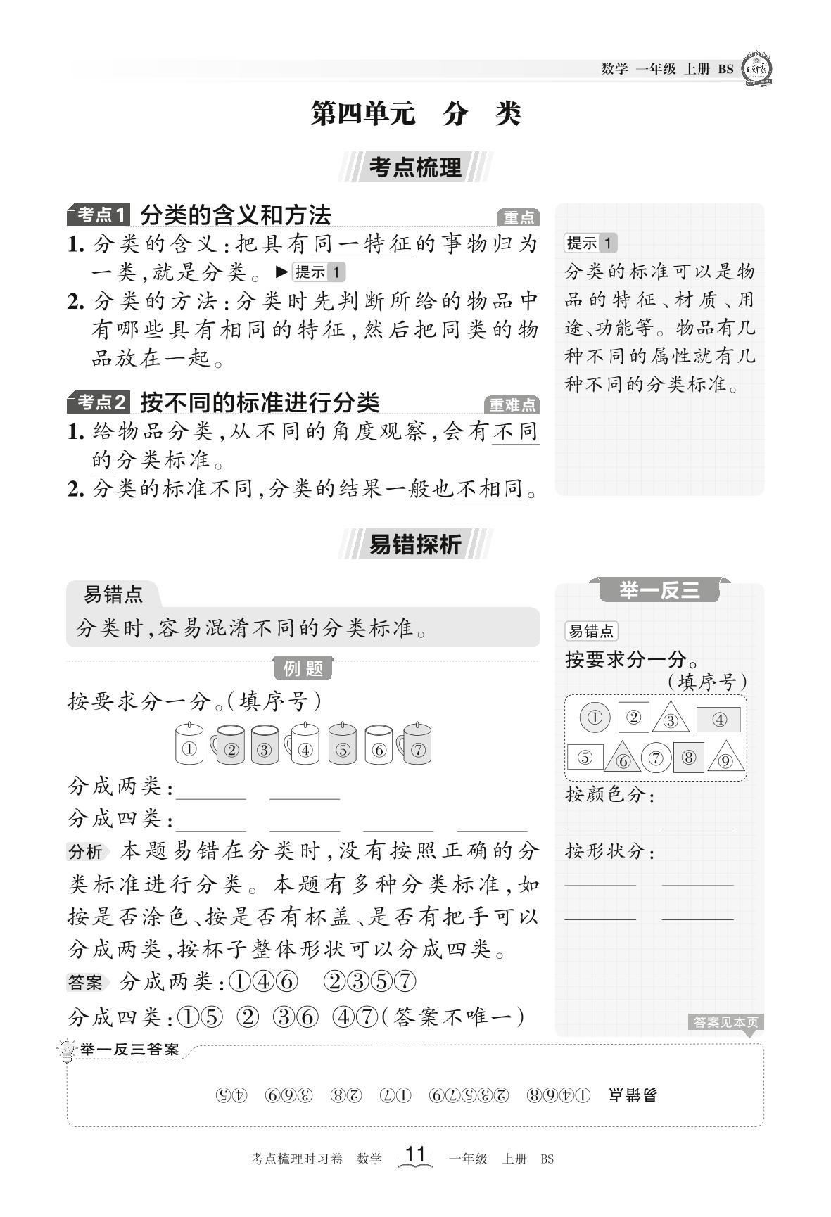 2023上册一年级数学北师版 考点梳理手册——第四单元 分类