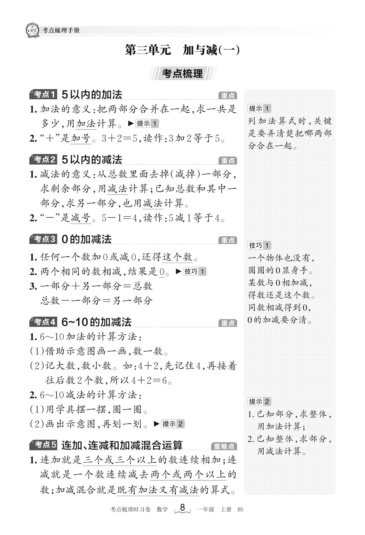 2023上册一年级数学北师版 考点梳理手册——第三单元 加与减(一)