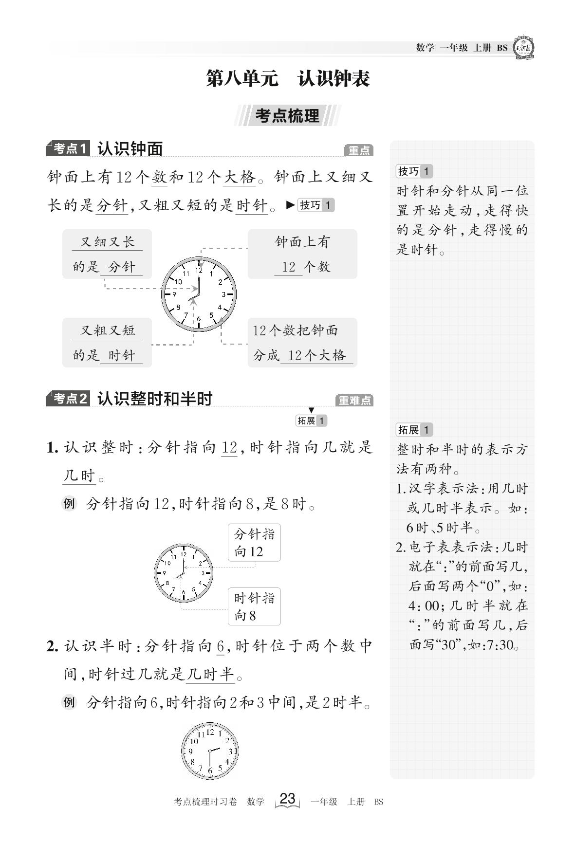 2023上册一年级数学北师版 考点梳理手册——第八单元 认识钟表
