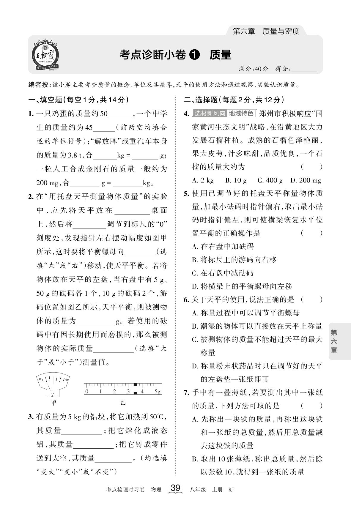 2023上册八年级物理人教版 第六章 考点诊断小卷1 质量
