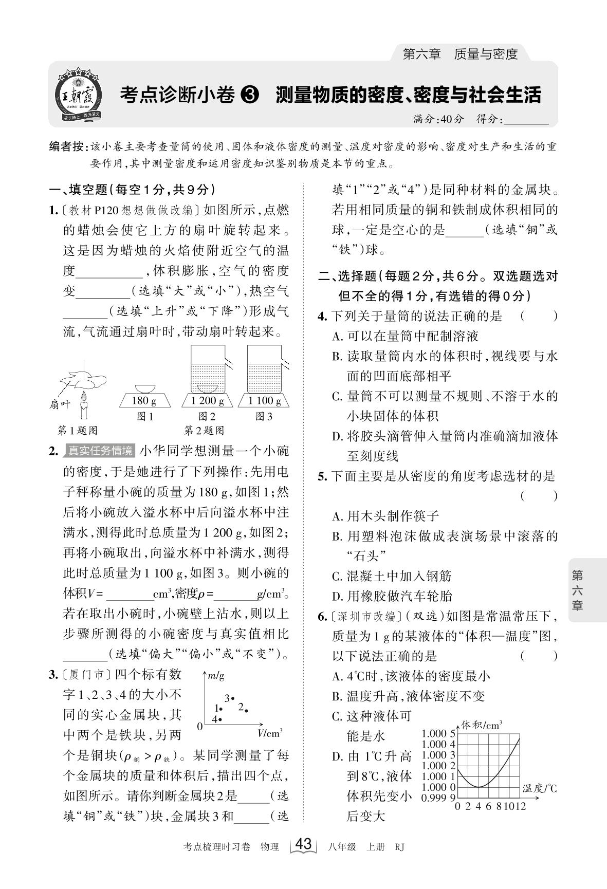 2023上册八年级物理人教版 第六章 考点诊断小卷3 测量物质的密度、密度与社会生活