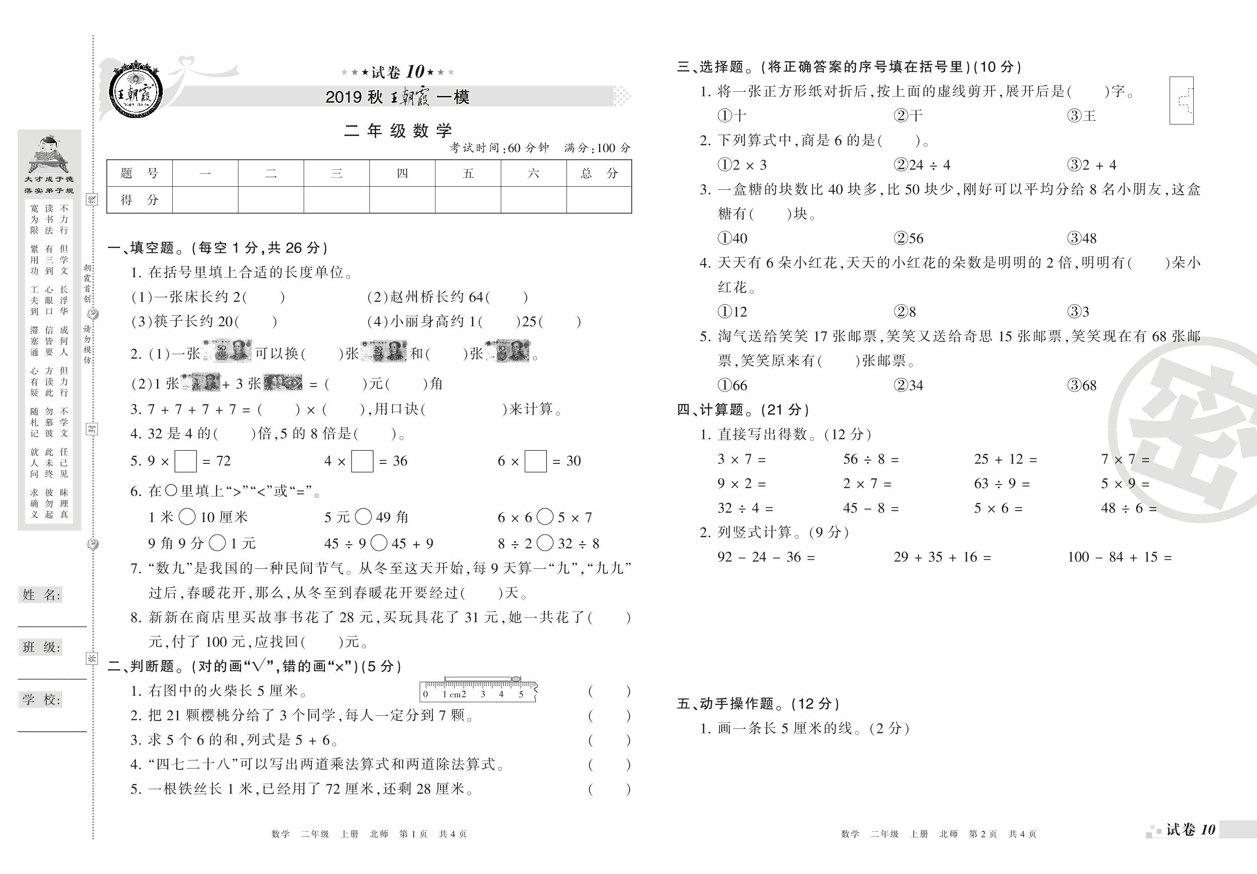 王朝霞期末模拟卷二年级上册数学(北师版)_R21080393003【10】