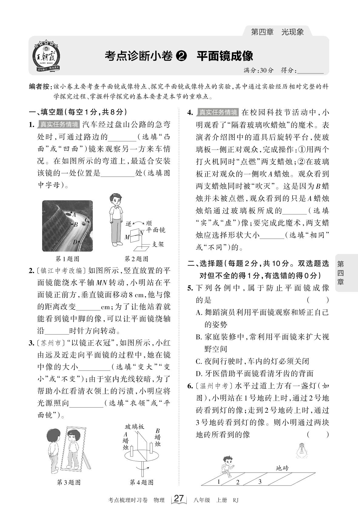 2023上册八年级物理人教版 第四章 考点诊断小卷2 平面镜成像