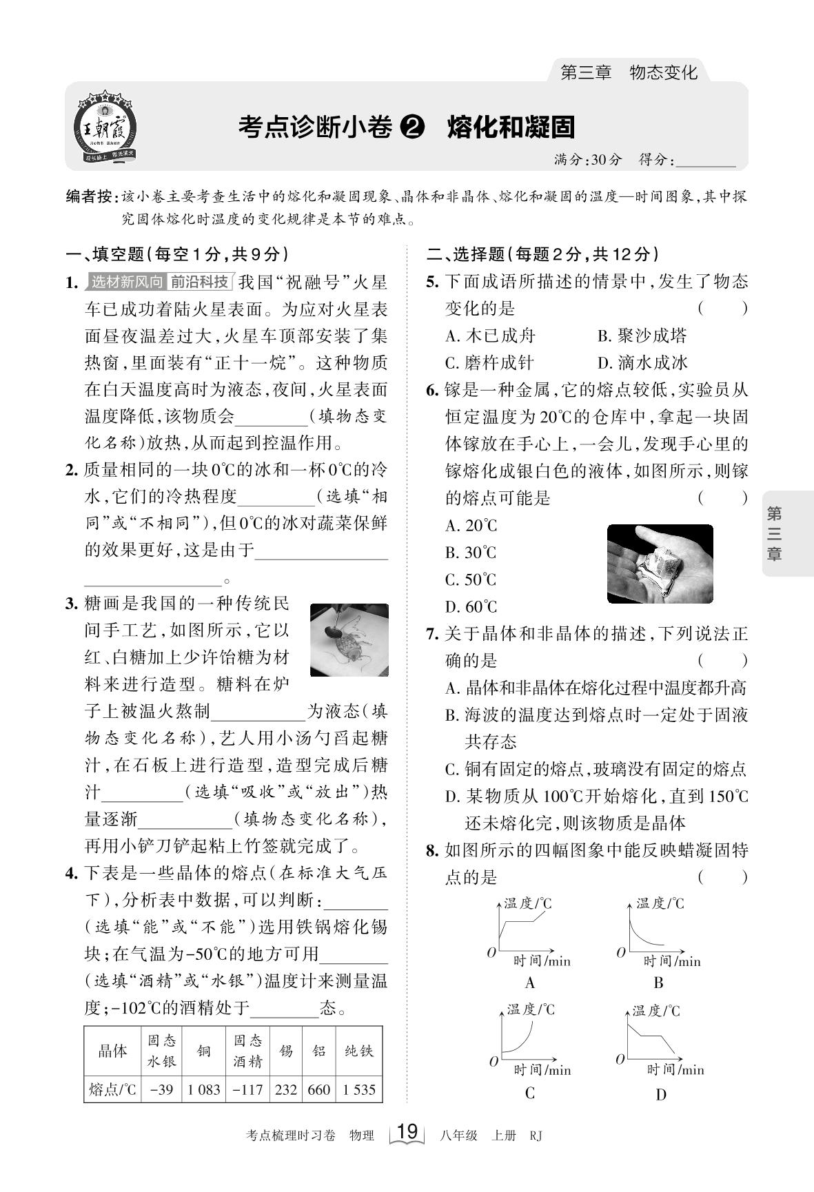 2023上册八年级物理人教版 第三章 考点诊断小卷2 熔化和凝固