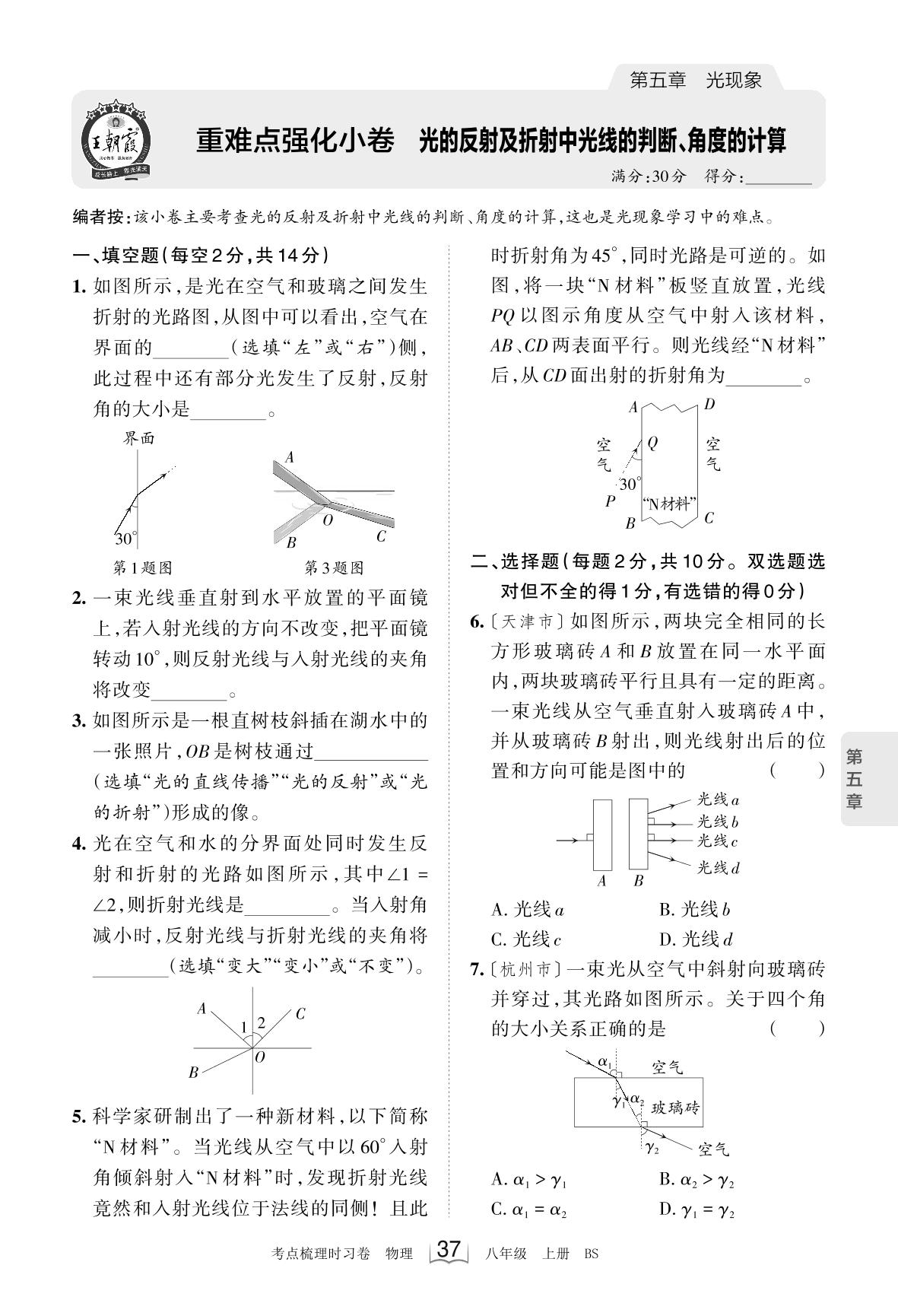 2023上册八年级物理北师版 第五章 重难点强化小卷 光的反射及折射中光线的判断、角度的计算