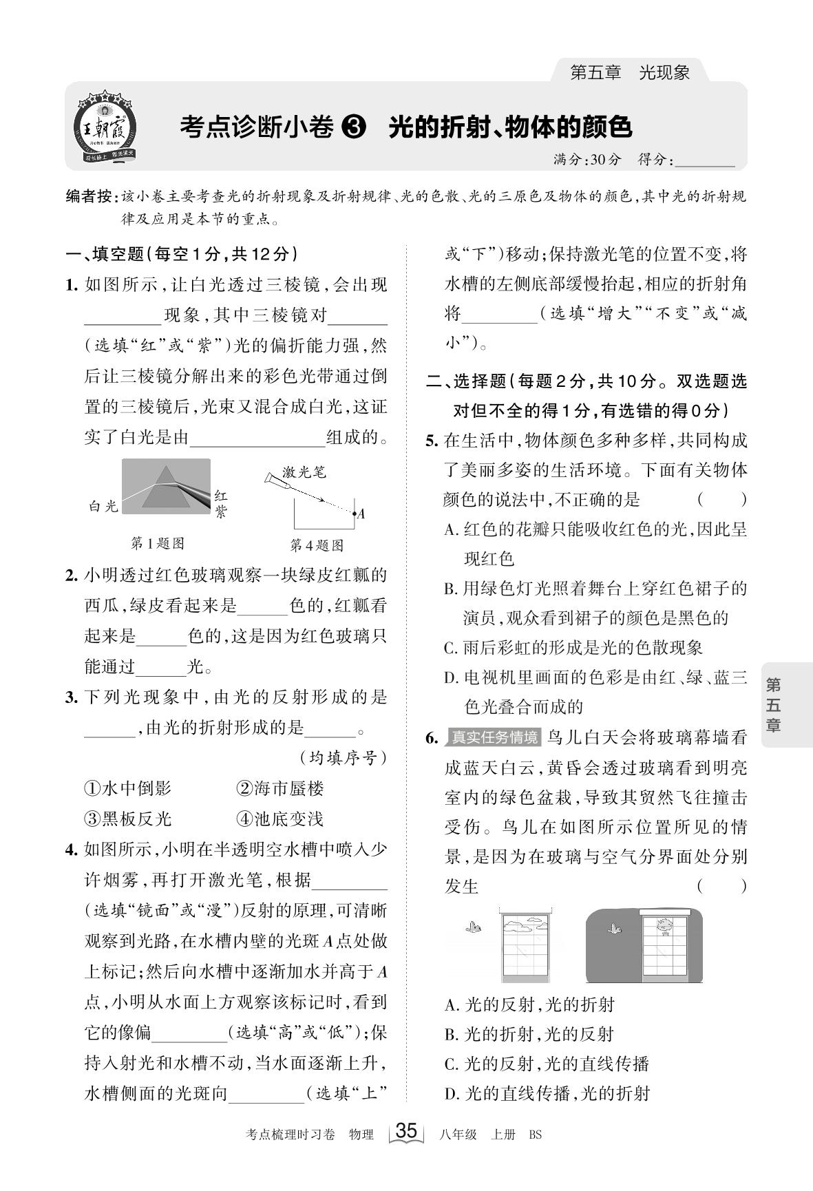 2023上册八年级物理北师版 第五章 考点诊断小卷3 光的折射、物体的颜色